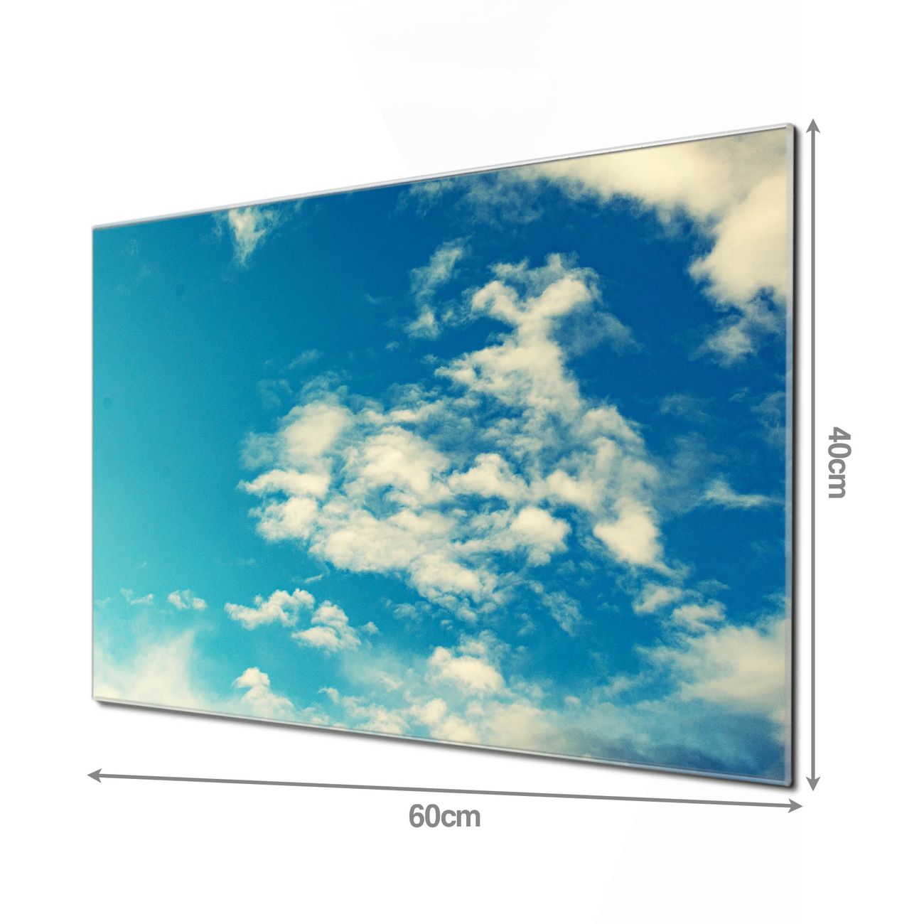 Material: 4mm Sicherheitsglas mit Metallrückwand Eigenschaften: beschreibbar, magnetisch, kratzfest Maße: 60x40x0,6cm, 3,6kg schwer Motiv Nummer 12834 Wolken 5 Zubehör: inklusive 4 Neodym-Magnete