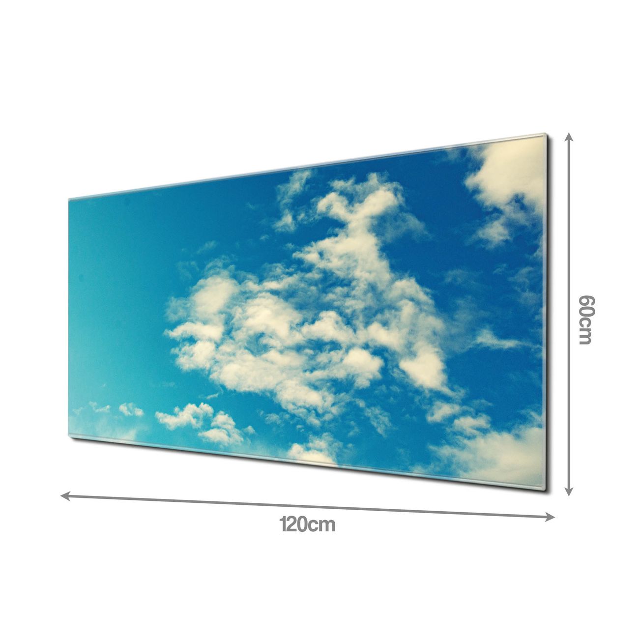 Material: 4mm Sicherheitsglas mit Metallrückwand Eigenschaften: beschreibbar, magnetisch, kratzfest Maße: 120x60x0,6cm, 10,80kg schwer Motiv Nummer 12834 Wolken 5 Zubehör: inklusive 4 Neodym-Magnete