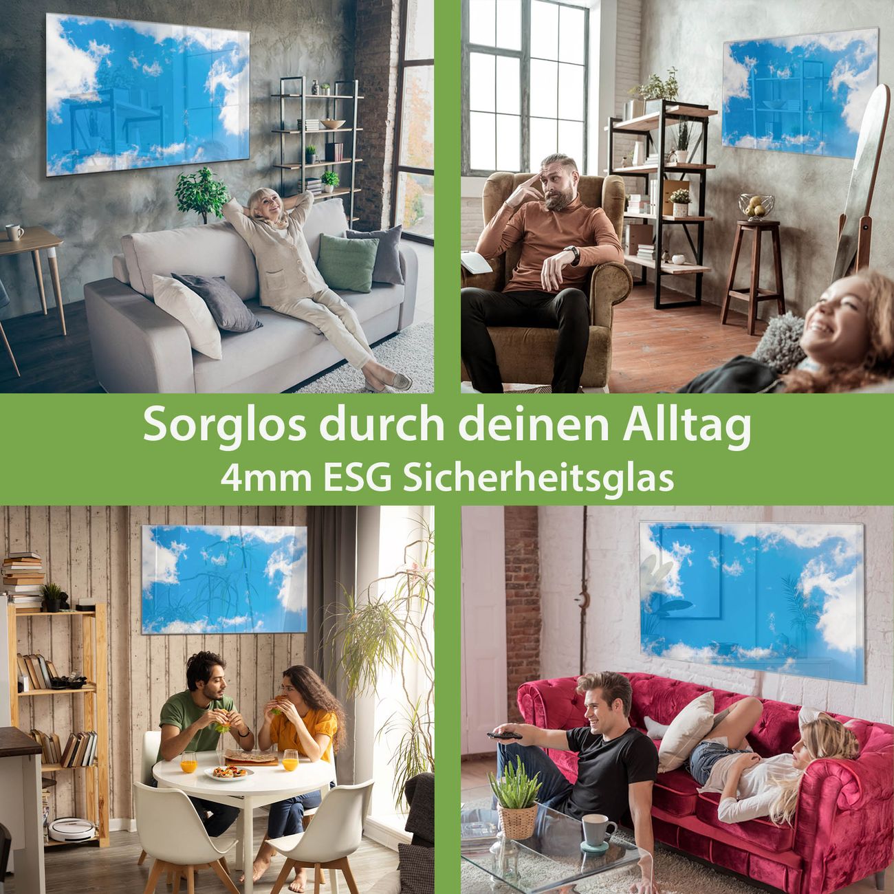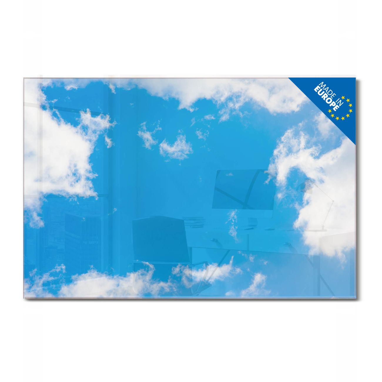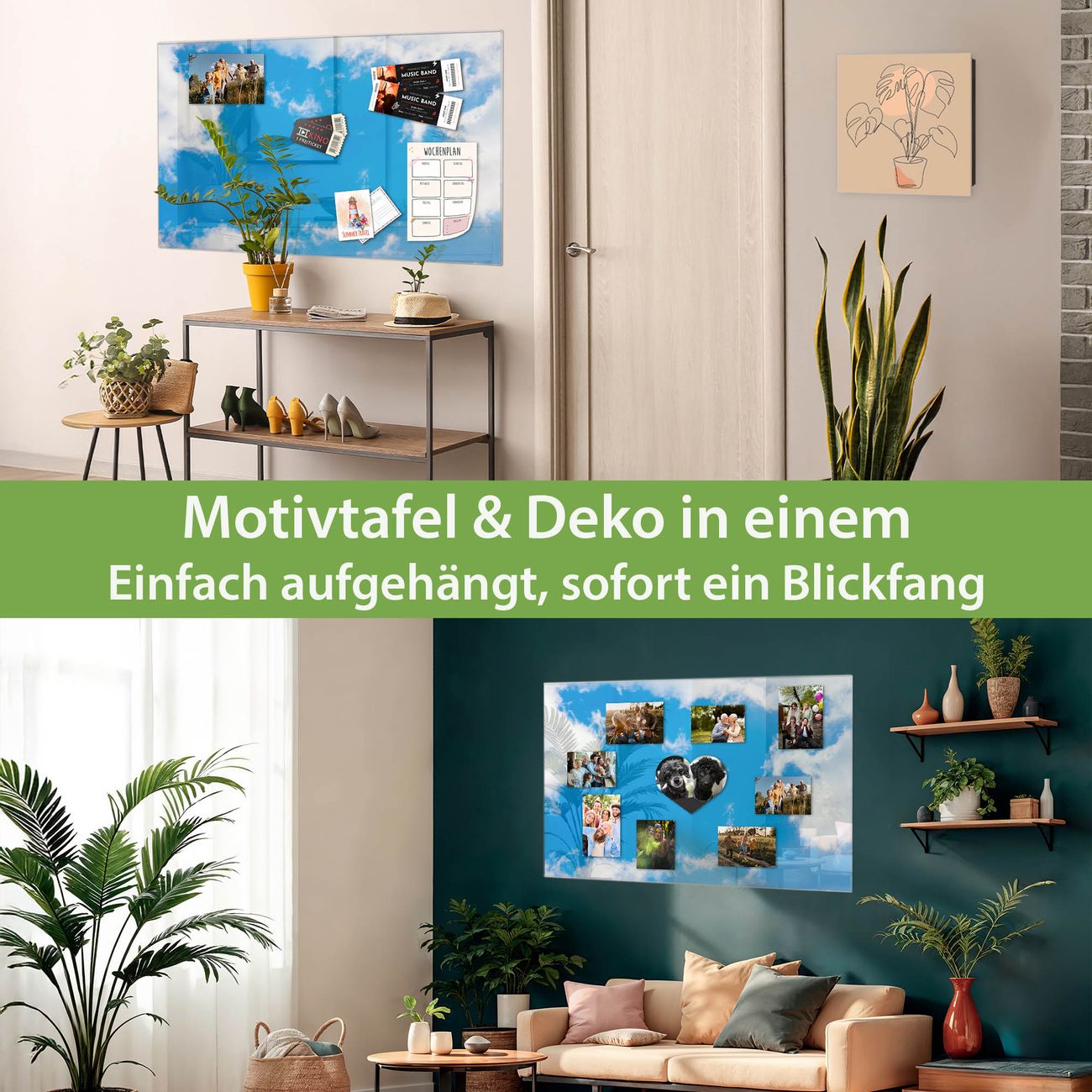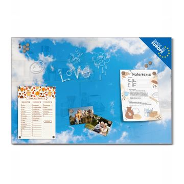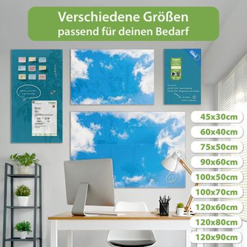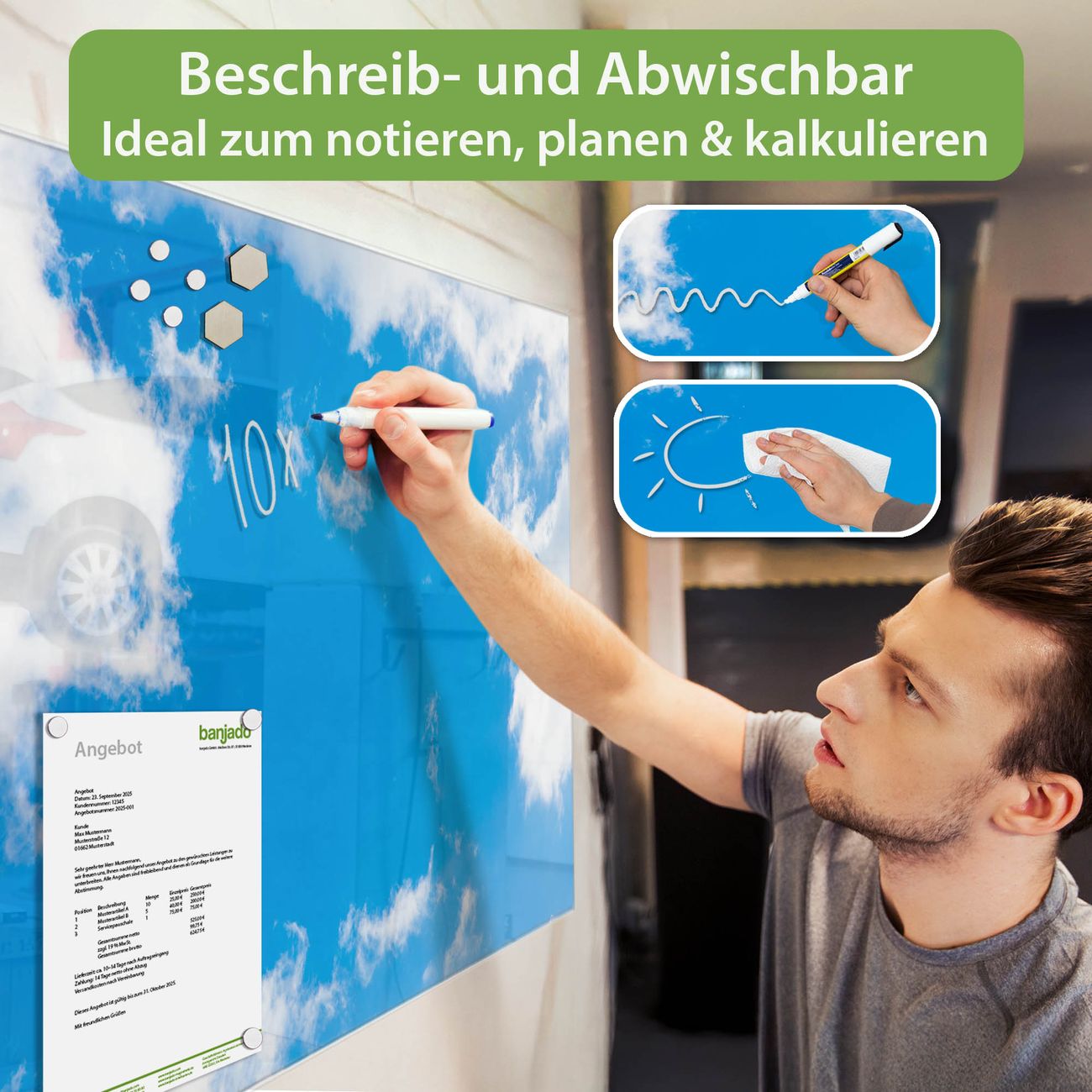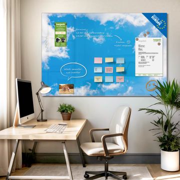 Material: 4mm Sicherheitsglas mit Metallrückwand Eigenschaften: beschreibbar, magnetisch, kratzfest Maße: 75x50x0,6cm, 5,63kg schwer Motiv Nummer 12838 Wolken 9 Zubehör: inklusive 4 Neodym-Magnete