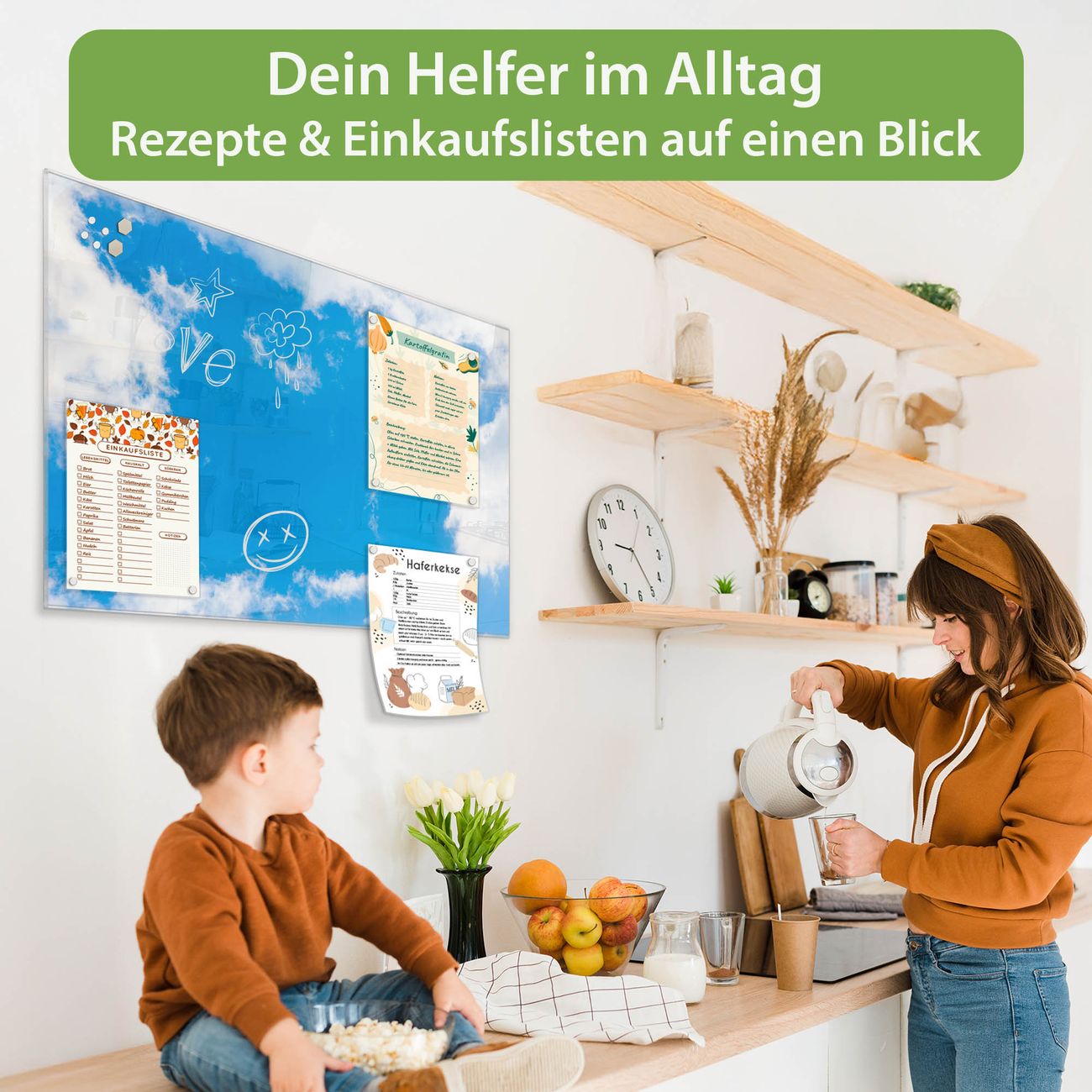 Auf der glatten Glasoberfläche lassen sich Termine, Rezepte oder Notizen ganz einfach mit Kreidestiften festhalten und rückstandslos entfernen. Starke Neodym-Magnete halten Ihre wichtigsten Erinnerungen sicher an Ort und Stelle. So entsteht Ihre ganz persönliche Ideenwand - jeden Tag neu.