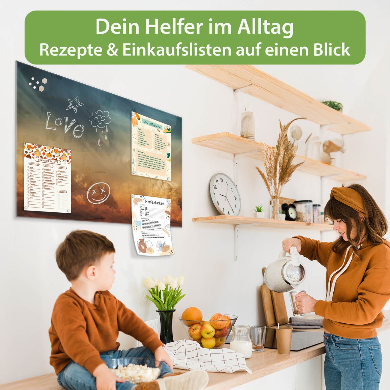Ein Stück Design, das Ihren Alltag organisiert. Schreiben, heften, inspirieren - alles an einem Ort. Qualität, die man spürt. Montage leicht gemacht. Handwerk mit Herz - veredelt in Sachsen. Einzigartiges Design mit Motiv Motiv Wolken in der Dämmerung Beschreibbare Glasoberfläche, leicht zu reinigen Starke Magnetkraft durch Stahlrückwand Inklusive 4 Neodym-Magneten Flexible Montageoptionen Handveredelt in Sachsen - Qualität, die bleibt