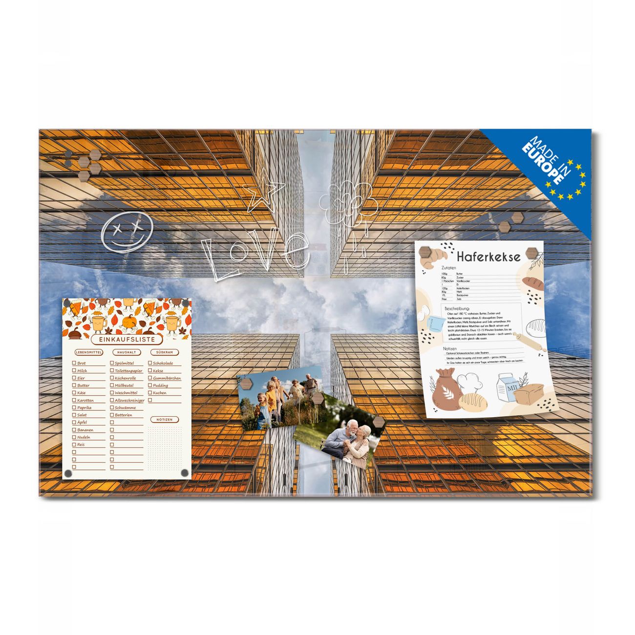 Ein Stück Design, das Ihren Alltag organisiert. Schreiben, heften, inspirieren - alles an einem Ort. Qualität, die man spürt. Montage leicht gemacht. Handwerk mit Herz - veredelt in Sachsen. Einzigartiges Design mit Motiv Motiv Wolkenkratzer 2 Beschreibbare Glasoberfläche, leicht zu reinigen Starke Magnetkraft durch Stahlrückwand Inklusive 4 Neodym-Magneten Flexible Montageoptionen Handveredelt in Sachsen - Qualität, die bleibt