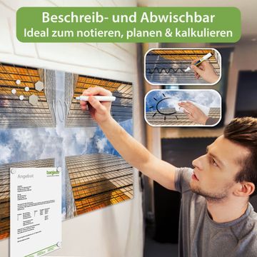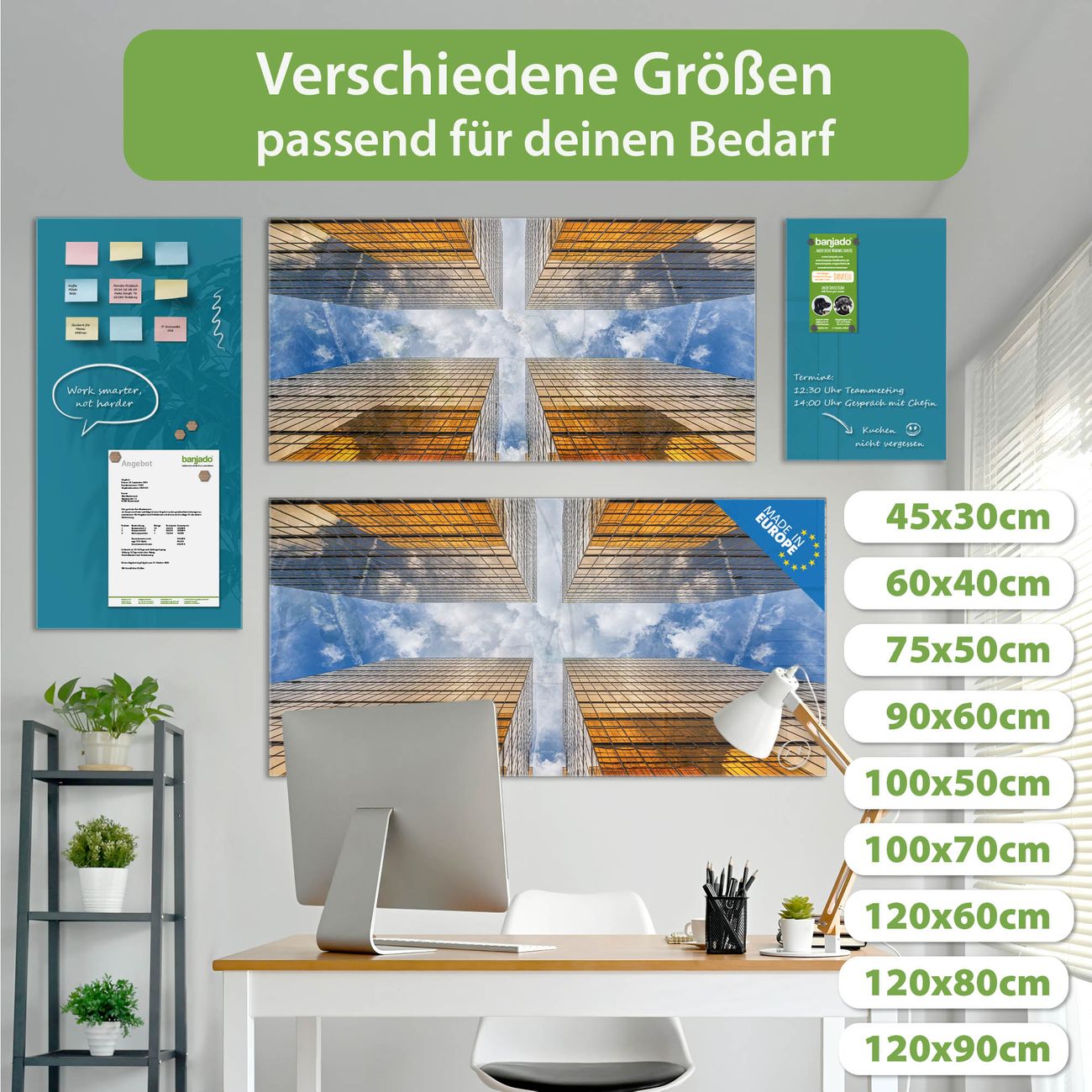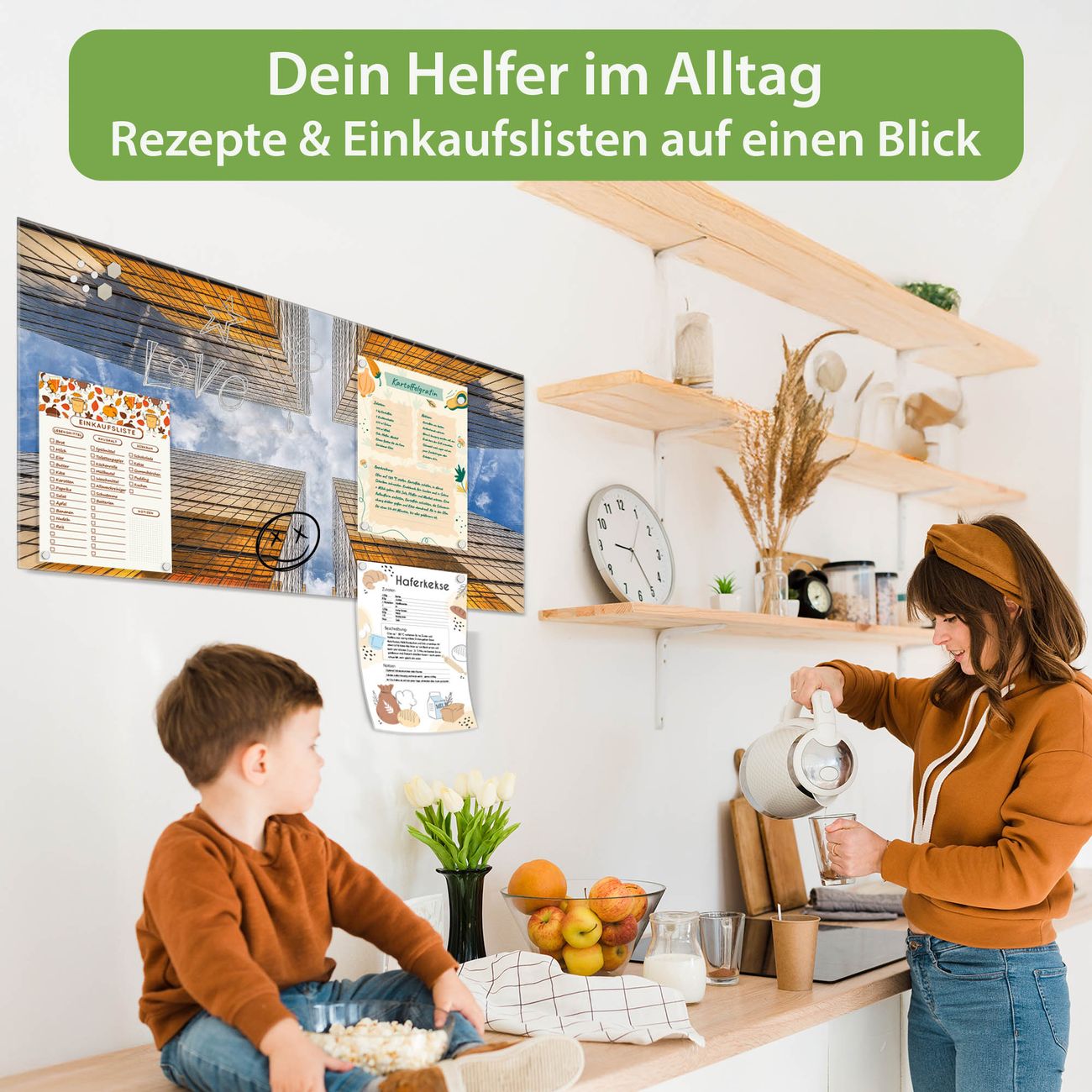 Material: 4mm Sicherheitsglas mit Metallrückwand Eigenschaften: beschreibbar, magnetisch, kratzfest Maße: 100x50x0,6cm, 7,50kg schwer Motiv Nummer 12889 Wolkenkratzer 2 Zubehör: inklusive 4 Neodym-Magnete
