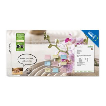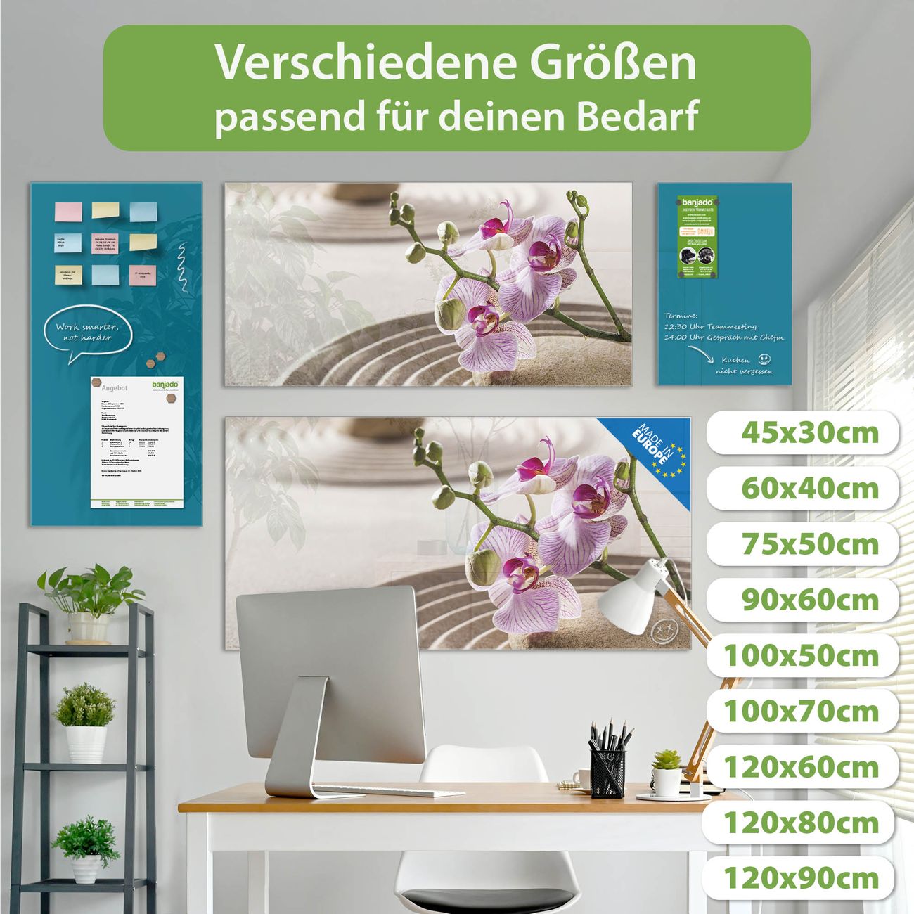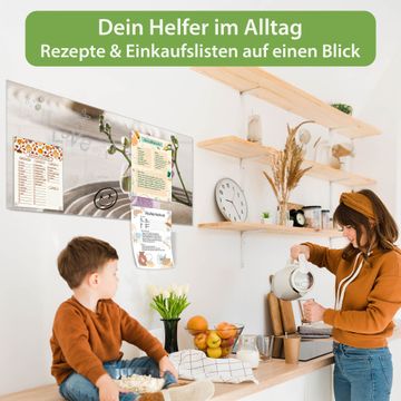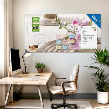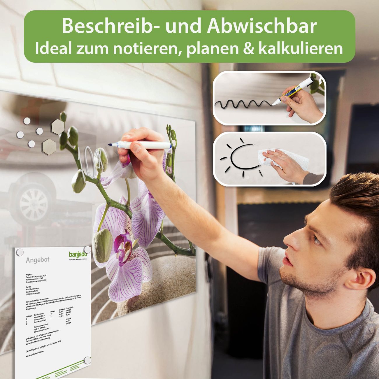 Material: 4mm Sicherheitsglas mit Metallrückwand Eigenschaften: beschreibbar, magnetisch, kratzfest Maße: 120x60x0,6cm, 10,80kg schwer Motiv Nummer 12120 Zen Relax Zubehör: inklusive 4 Neodym-Magnete
