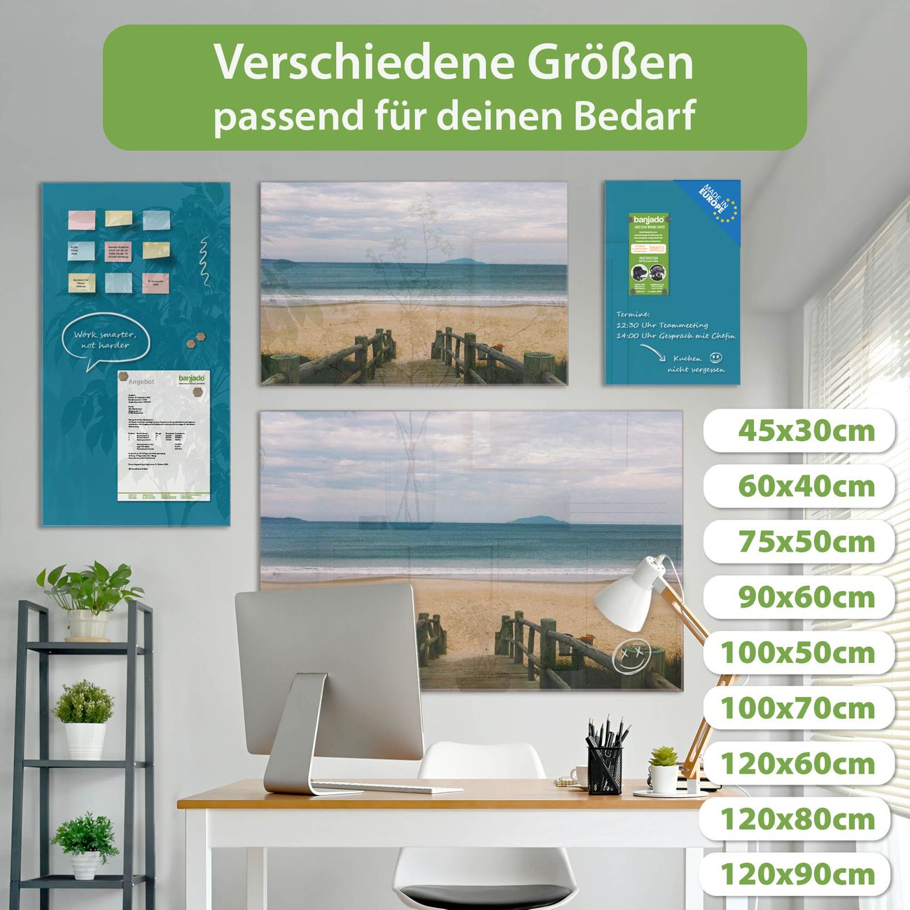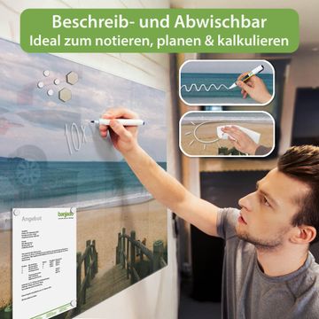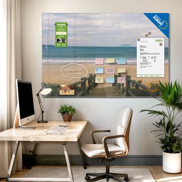 Material: 4mm Sicherheitsglas mit Metallrückwand Eigenschaften: beschreibbar, magnetisch, kratzfest Maße: 90x60x0,6cm, 8,10kg schwer Motiv Nummer 11848 Zum Strand Zubehör: inklusive 4 Neodym-Magnete