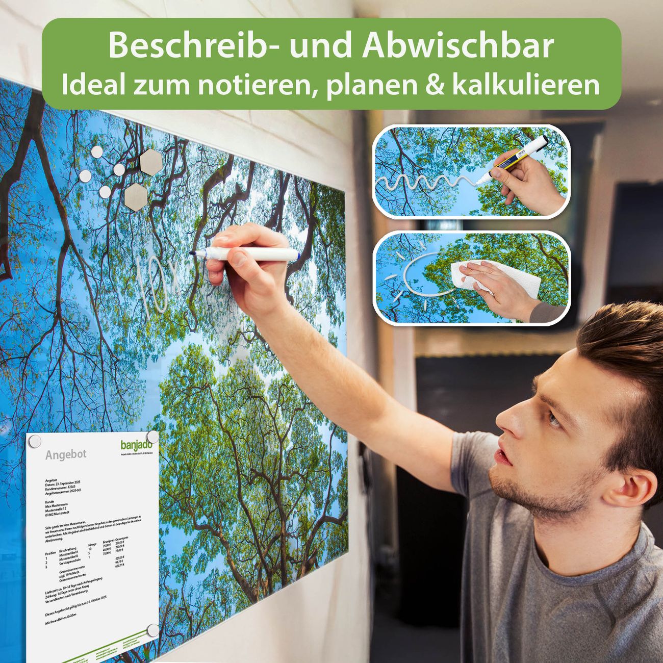 Material: 4mm Sicherheitsglas mit Metallrückwand Eigenschaften: beschreibbar, magnetisch, kratzfest Maße: 75x50x0,6cm, 5,63kg schwer Motiv Nummer 12874 Zwischen Bäumen 2 Zubehör: inklusive 4 Neodym-Magnete