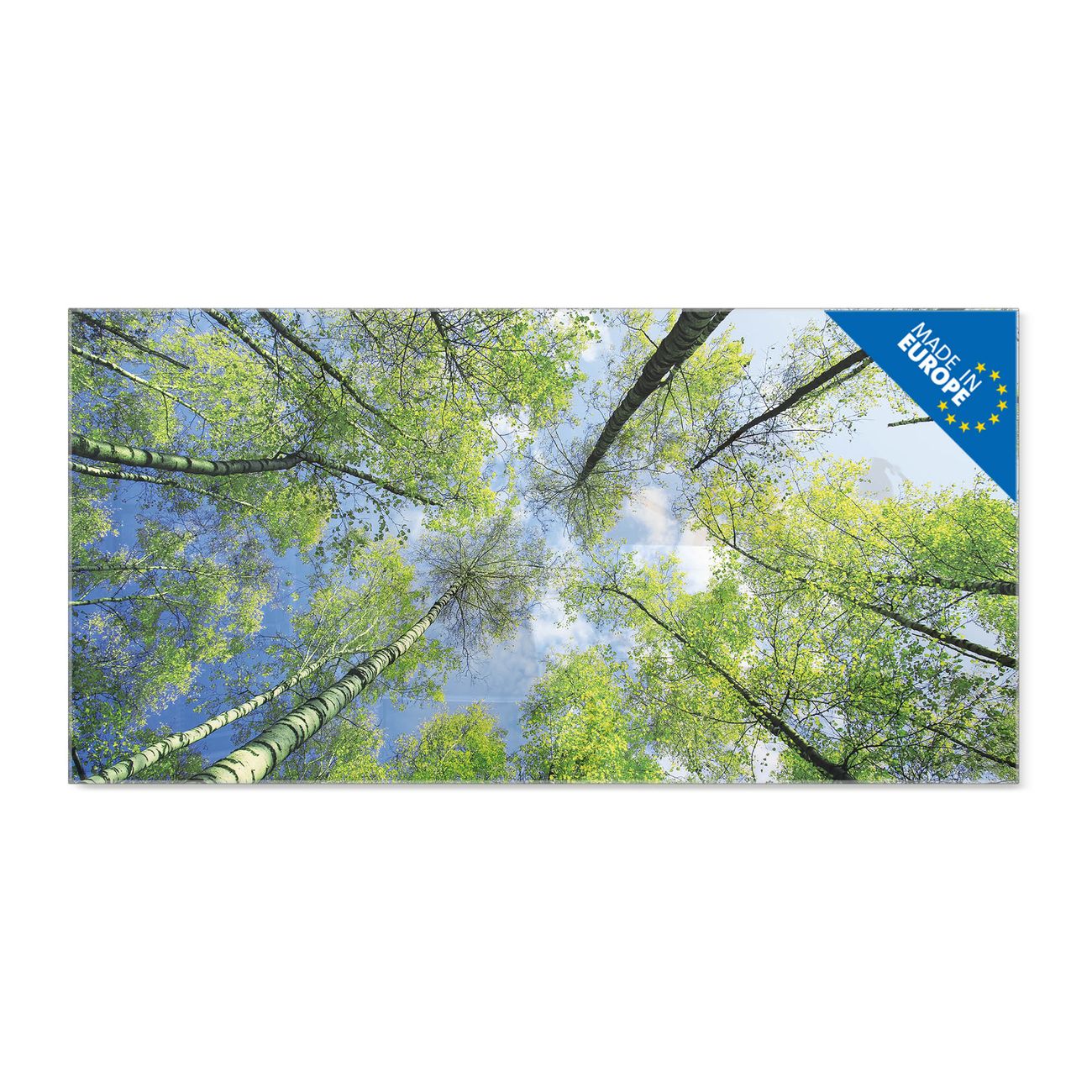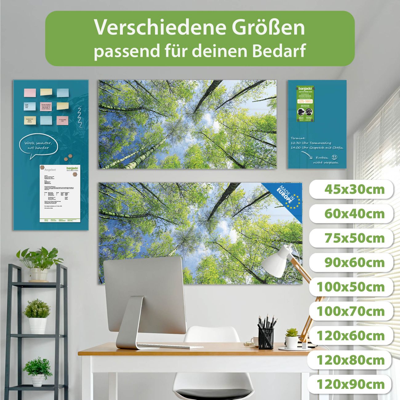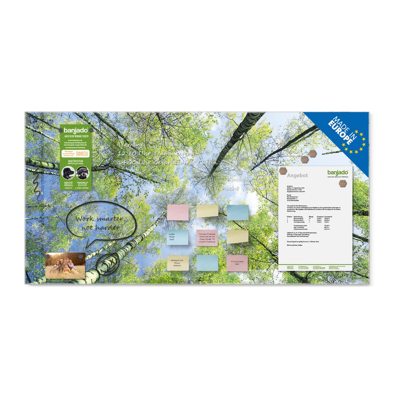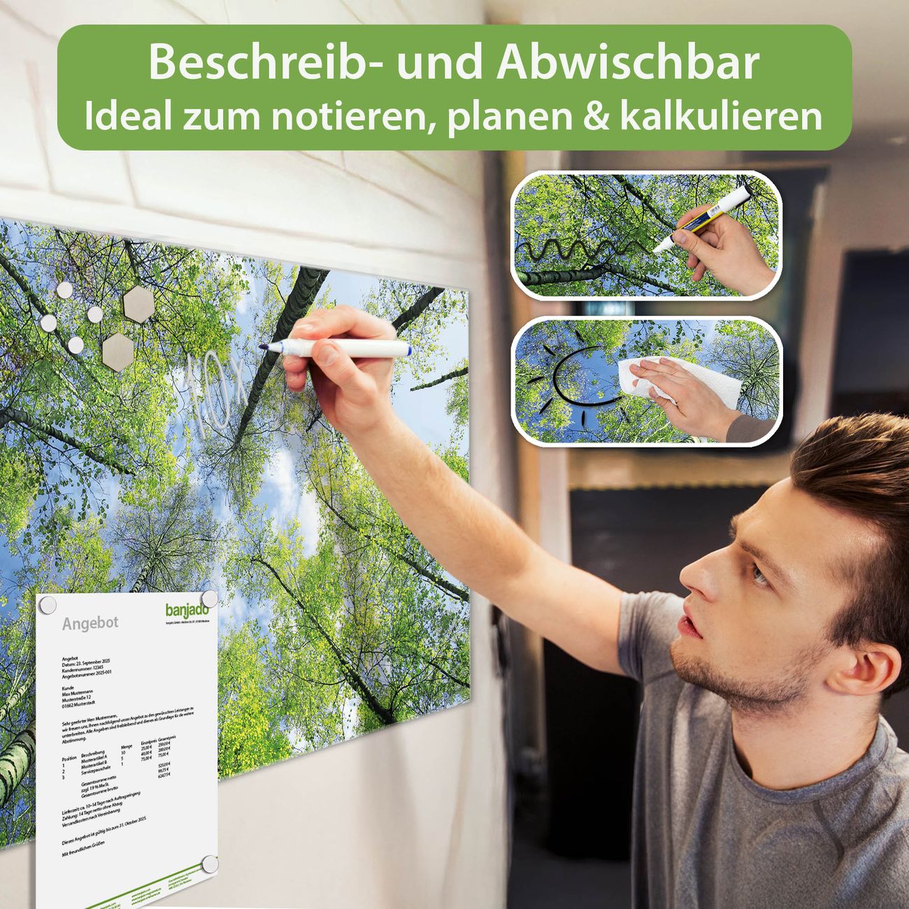 Material: 4mm Sicherheitsglas mit Metallrückwand Eigenschaften: beschreibbar, magnetisch, kratzfest Maße: 100x50x0,6cm, 7,50kg schwer Motiv Nummer 12875 Zwischen Bäumen 3 Zubehör: inklusive 4 Neodym-Magnete