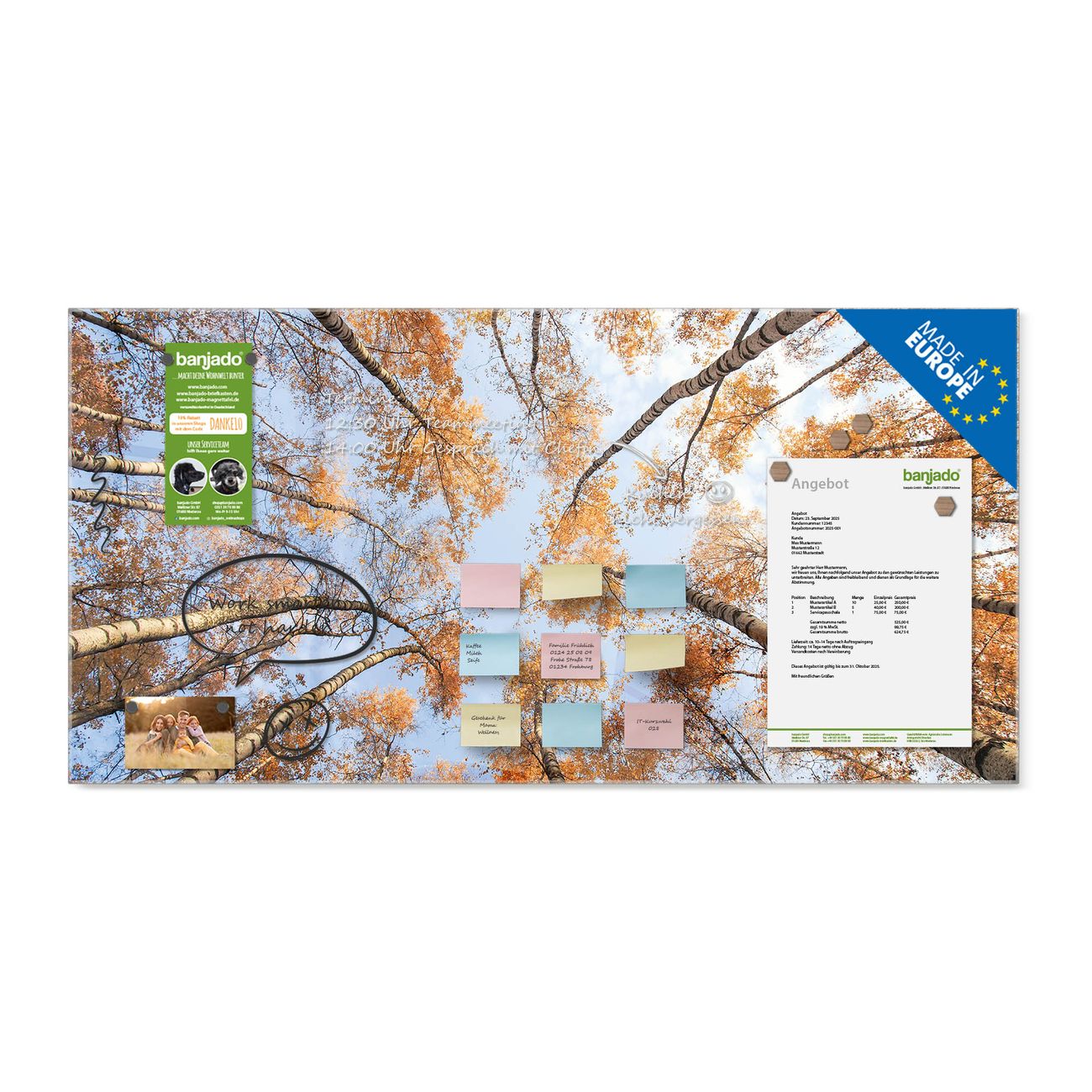 Material: 4mm Sicherheitsglas mit Metallrückwand Eigenschaften: beschreibbar, magnetisch, kratzfest Maße: 100x50x0,6cm, 7,50kg schwer Motiv Nummer 12876 Zwischen Bäumen 4 Zubehör: inklusive 4 Neodym-Magnete