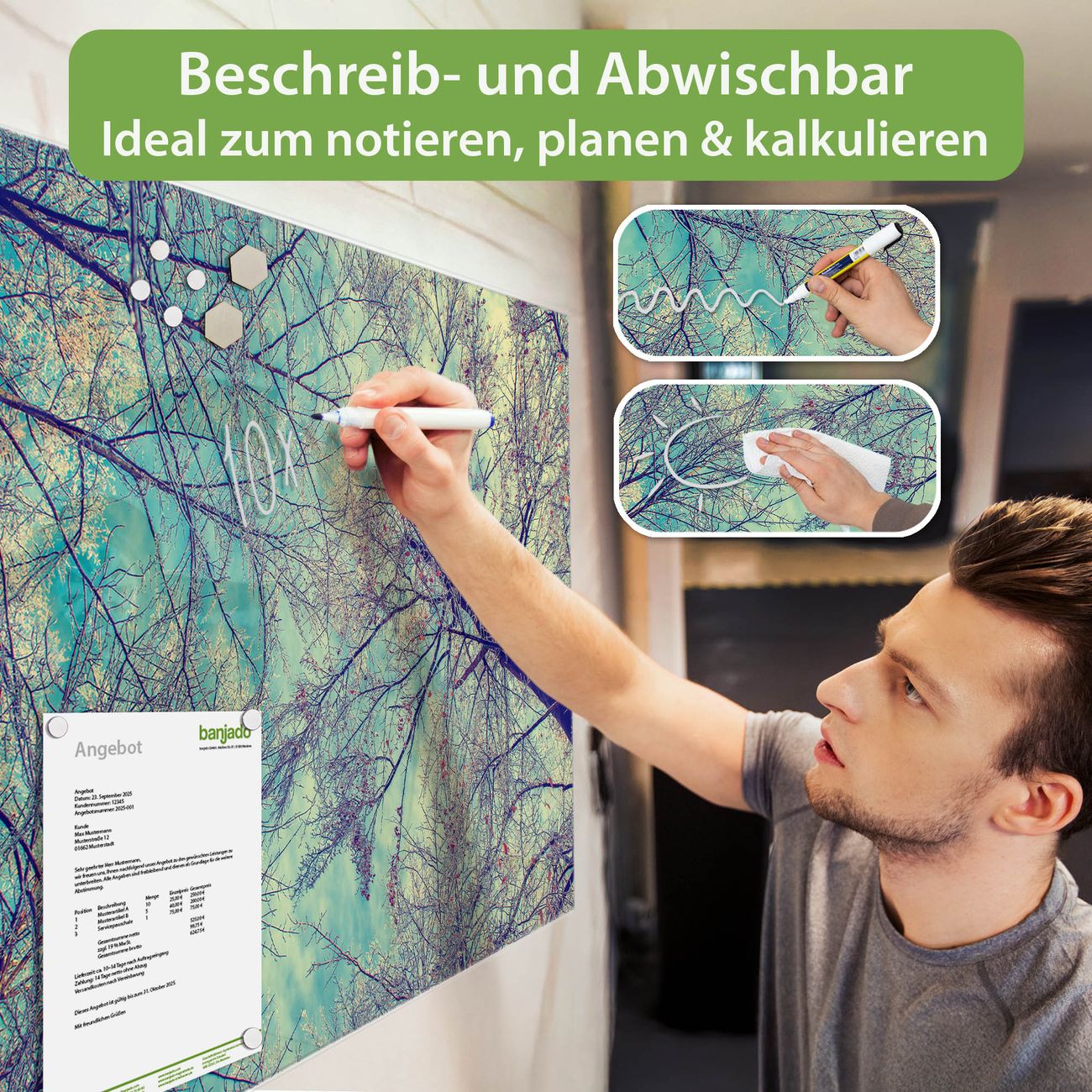 Material: 4mm Sicherheitsglas mit Metallrückwand Eigenschaften: beschreibbar, magnetisch, kratzfest Maße: 60x40x0,6cm, 3,6kg schwer Motiv Nummer 12880 Zwischen Bäumen 8 Zubehör: inklusive 4 Neodym-Magnete