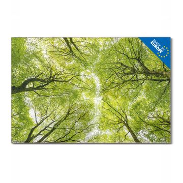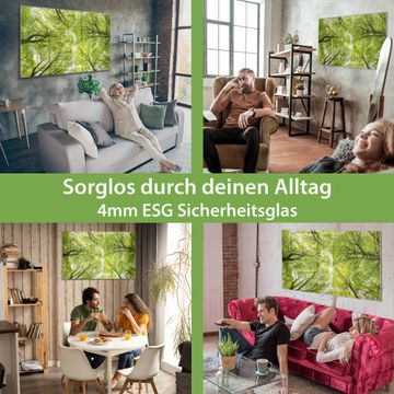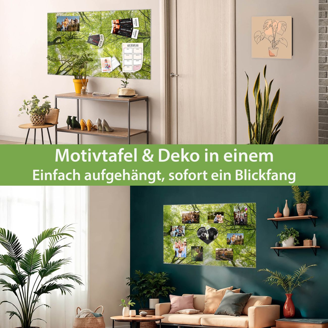 Material: 4mm Sicherheitsglas mit Metallrückwand Eigenschaften: beschreibbar, magnetisch, kratzfest Maße: 75x50x0,6cm, 5,63kg schwer Motiv Nummer 12873 Zwischen Bäumen Zubehör: inklusive 4 Neodym-Magnete
