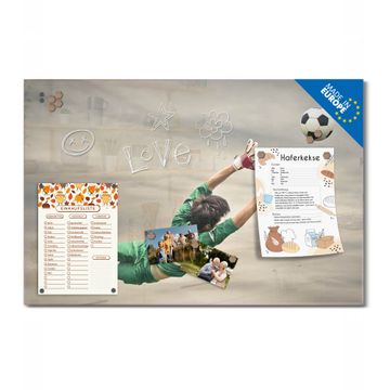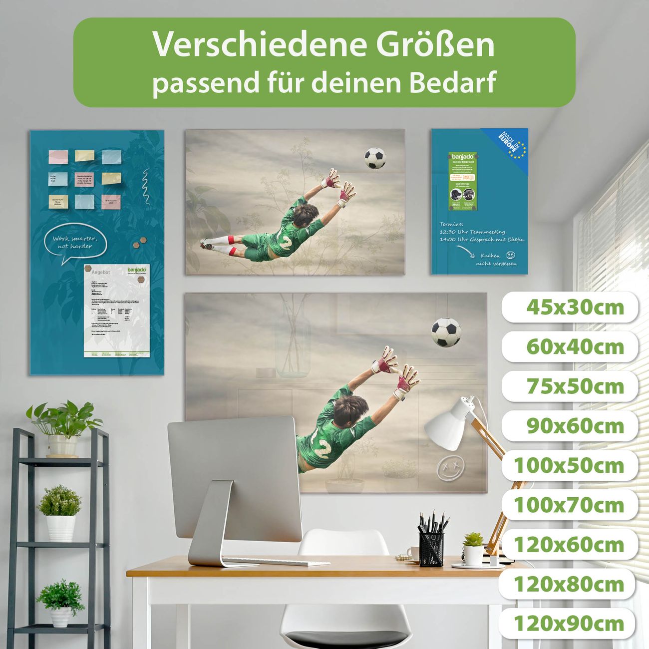 Material: 4mm Sicherheitsglas mit Metallrückwand Eigenschaften: beschreibbar, magnetisch, kratzfest Maße: 75x50x0,6cm, 5,63kg schwer Motiv Nummer 12628 Abgewehrt Zubehör: inklusive 4 Neodym-Magnete
