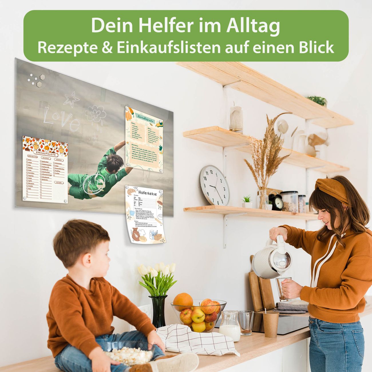 Auf der glatten Glasoberfläche lassen sich Termine, Rezepte oder Notizen ganz einfach mit Kreidestiften festhalten und rückstandslos entfernen. Starke Neodym-Magnete halten Ihre wichtigsten Erinnerungen sicher an Ort und Stelle. So entsteht Ihre ganz persönliche Ideenwand - jeden Tag neu.