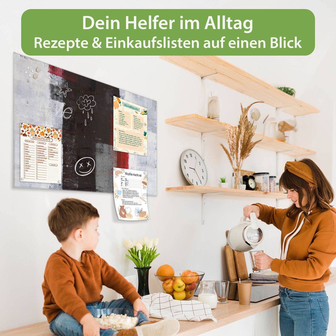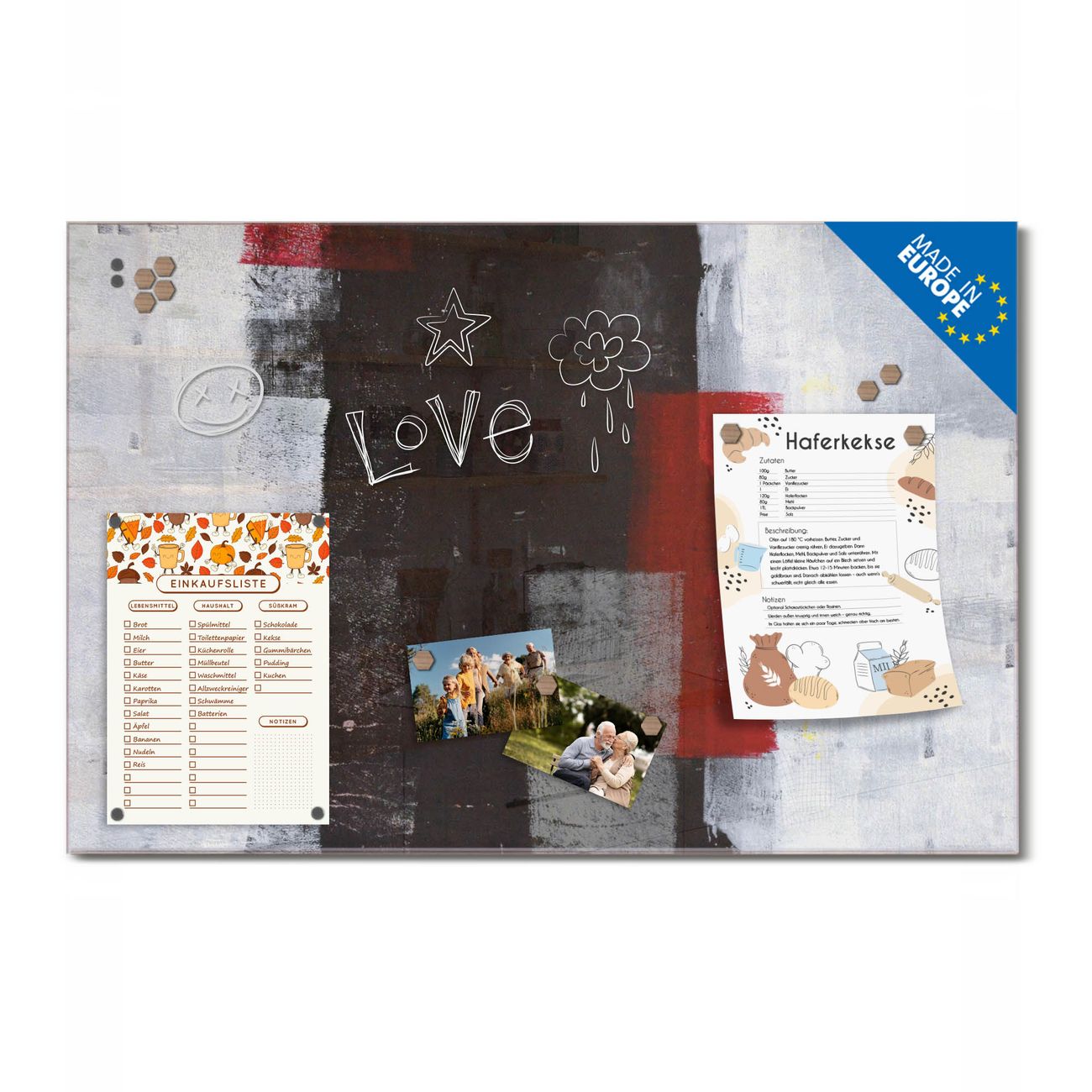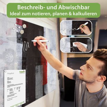 Auf der glatten Glasoberfläche lassen sich Termine, Rezepte oder Notizen ganz einfach mit Kreidestiften festhalten und rückstandslos entfernen. Starke Neodym-Magnete halten Ihre wichtigsten Erinnerungen sicher an Ort und Stelle. So entsteht Ihre ganz persönliche Ideenwand - jeden Tag neu.