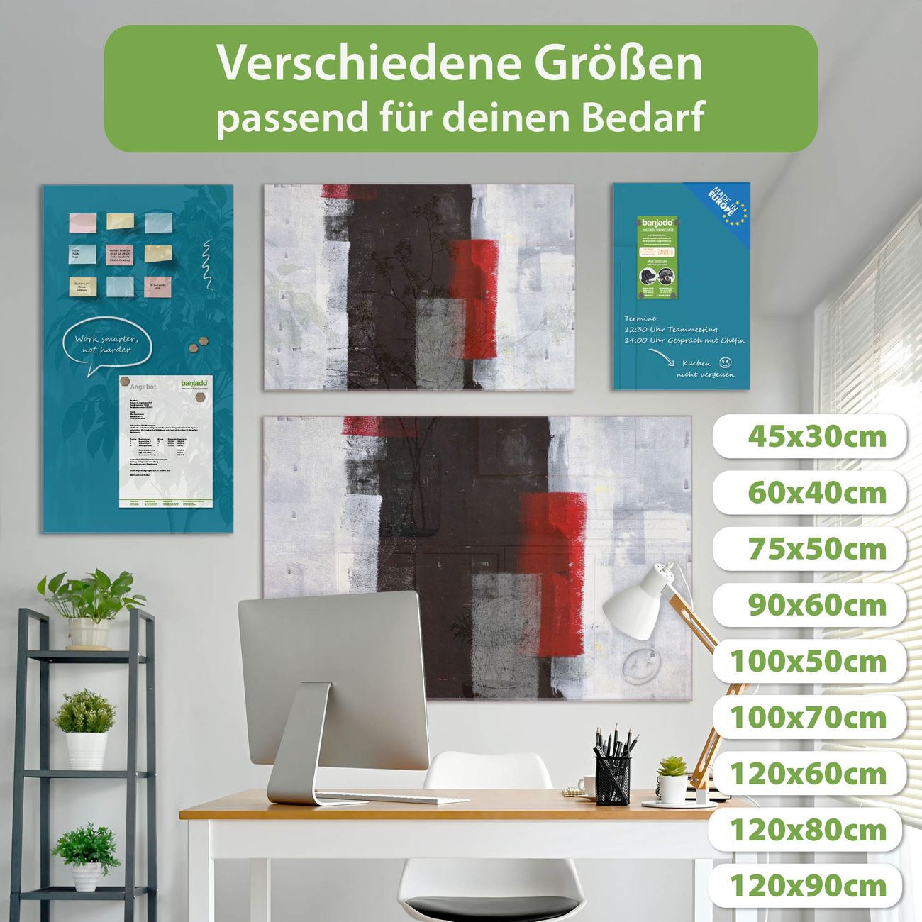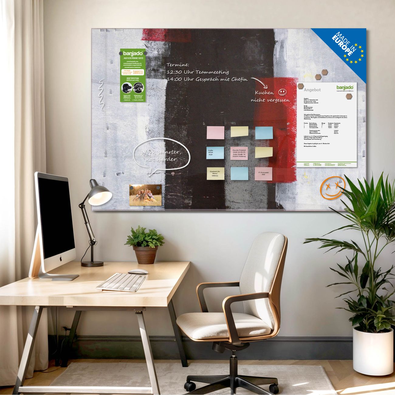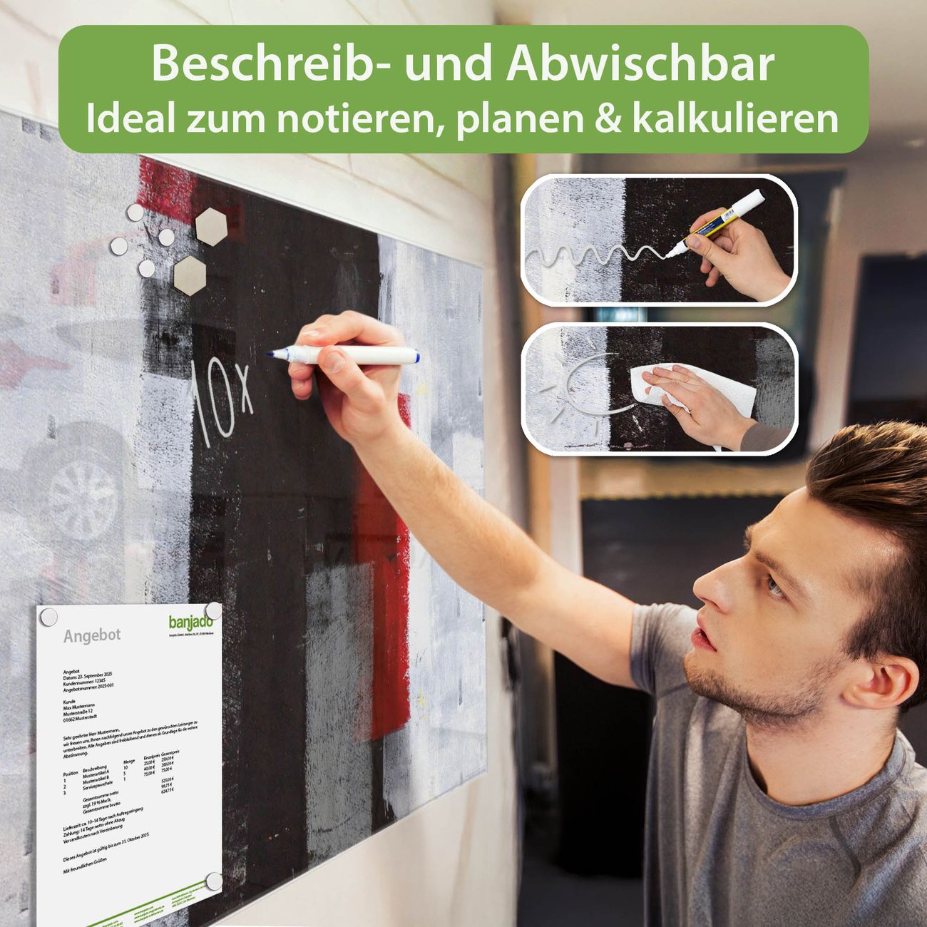 Jede Glas Magnettafel wird in unserer Werkstatt von Hand gefertigt und sorgfältig geprüft. So erhalten Sie ein echtes Qualitätsprodukt, das Funktion und Ästhetik perfekt vereint.?? Warum banjado?