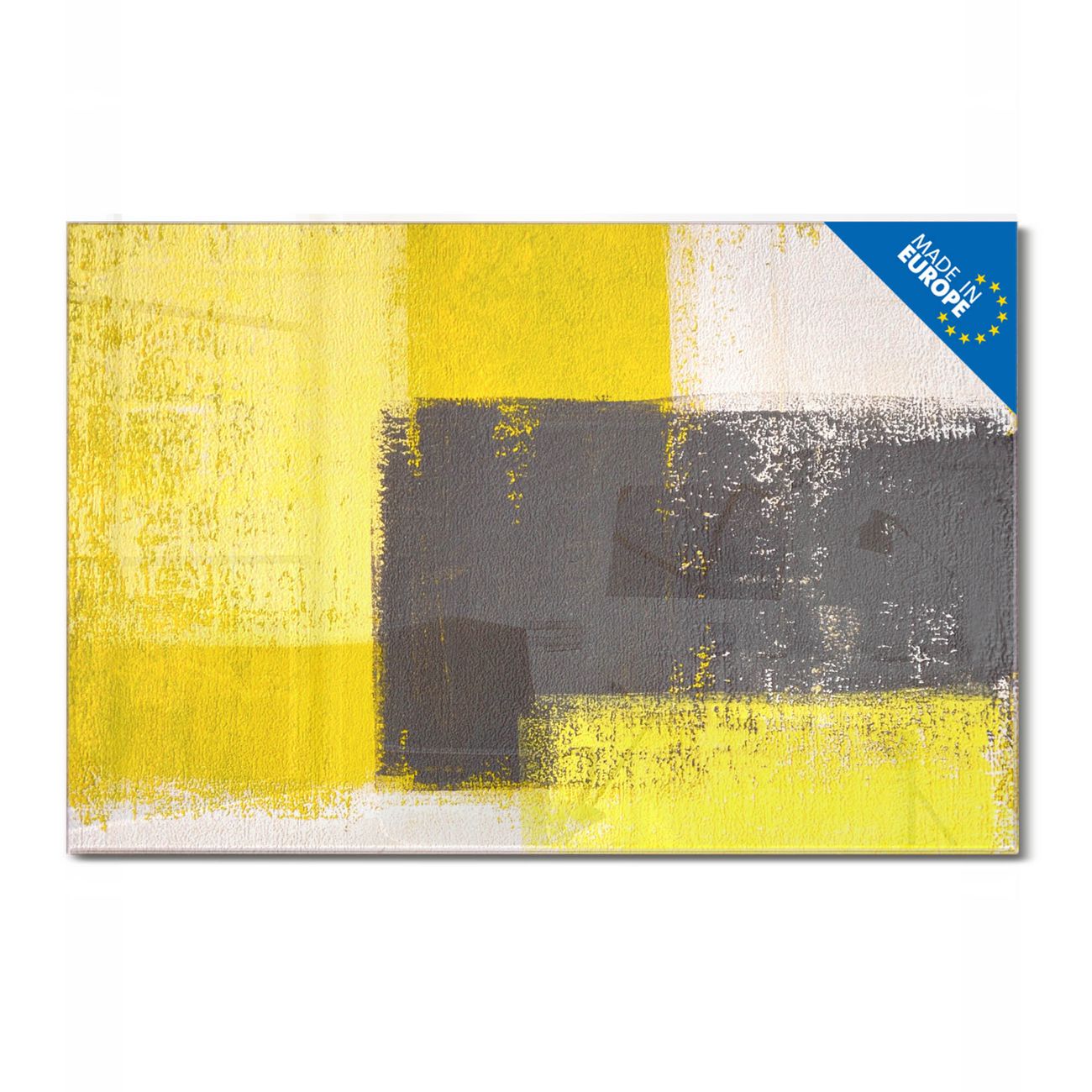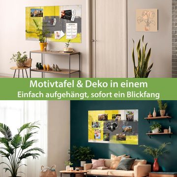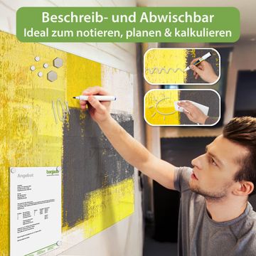 Material: 4mm Sicherheitsglas mit Metallrückwand Eigenschaften: beschreibbar, magnetisch, kratzfest Maße: 45x30x0,6cm, 2,03kg schwer Motiv Nummer 12149 Abstrakt Gelb Zubehör: inklusive 4 Neodym-Magnete