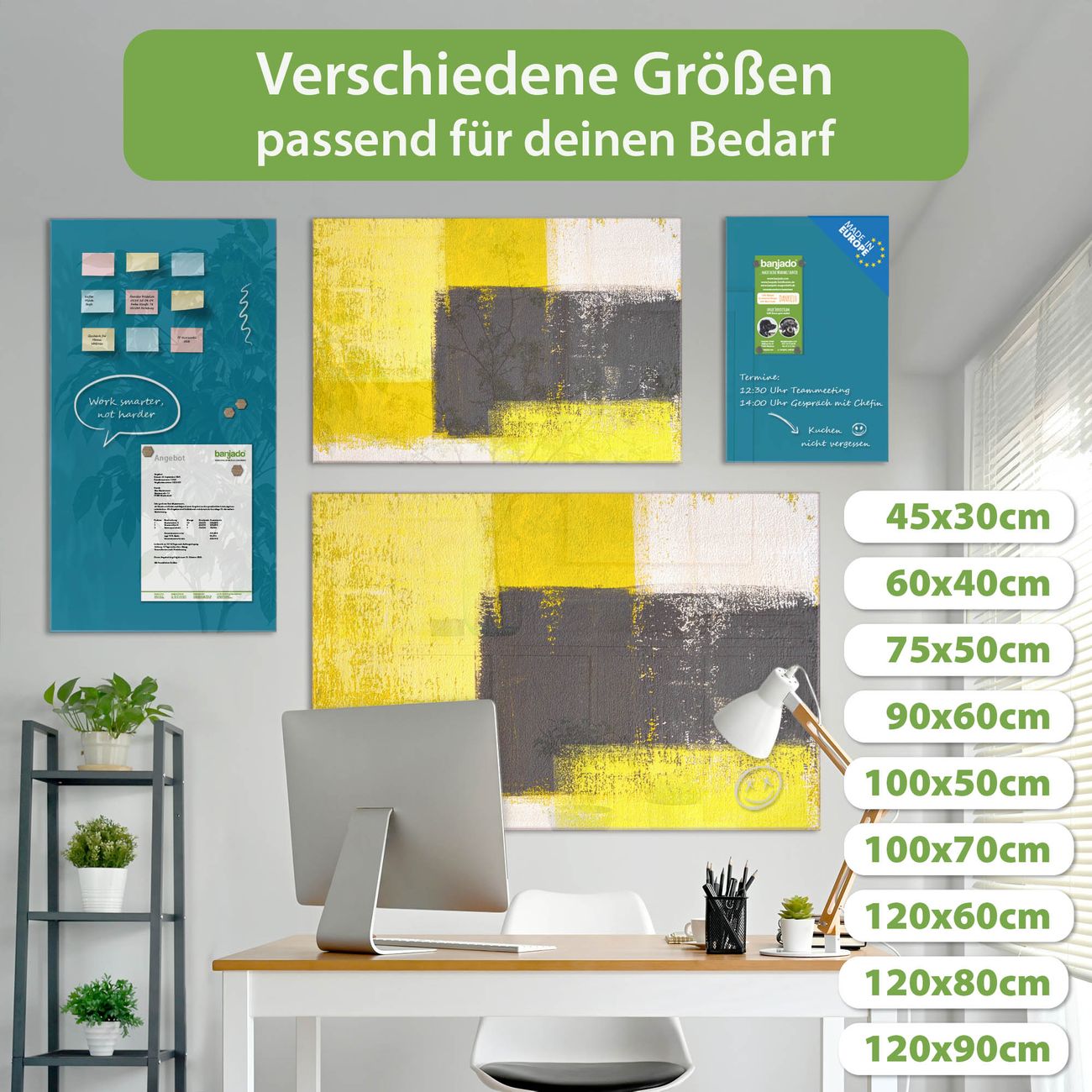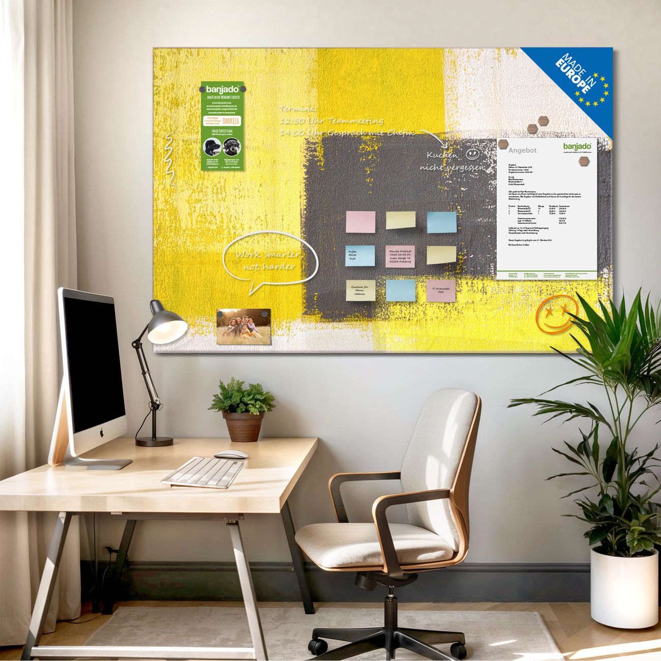 Jede Glas Magnettafel wird in unserer Werkstatt von Hand gefertigt und sorgfältig geprüft. So erhalten Sie ein echtes Qualitätsprodukt, das Funktion und Ästhetik perfekt vereint.?? Warum banjado?