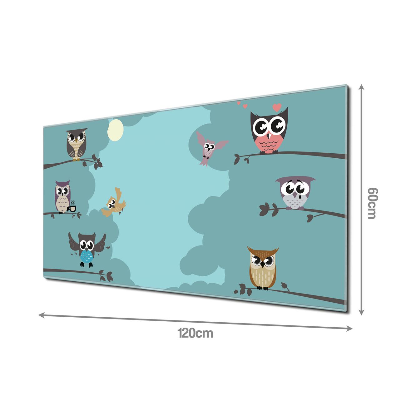 Material: 4mm Sicherheitsglas mit Metallrückwand Eigenschaften: beschreibbar, magnetisch, kratzfest Maße: 120x60x0,6cm, 10,80kg schwer Motiv Nummer 11562 Acht Eulen Zubehör: inklusive 4 Neodym-Magnete