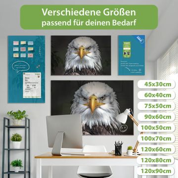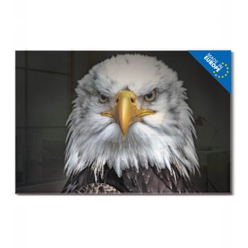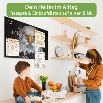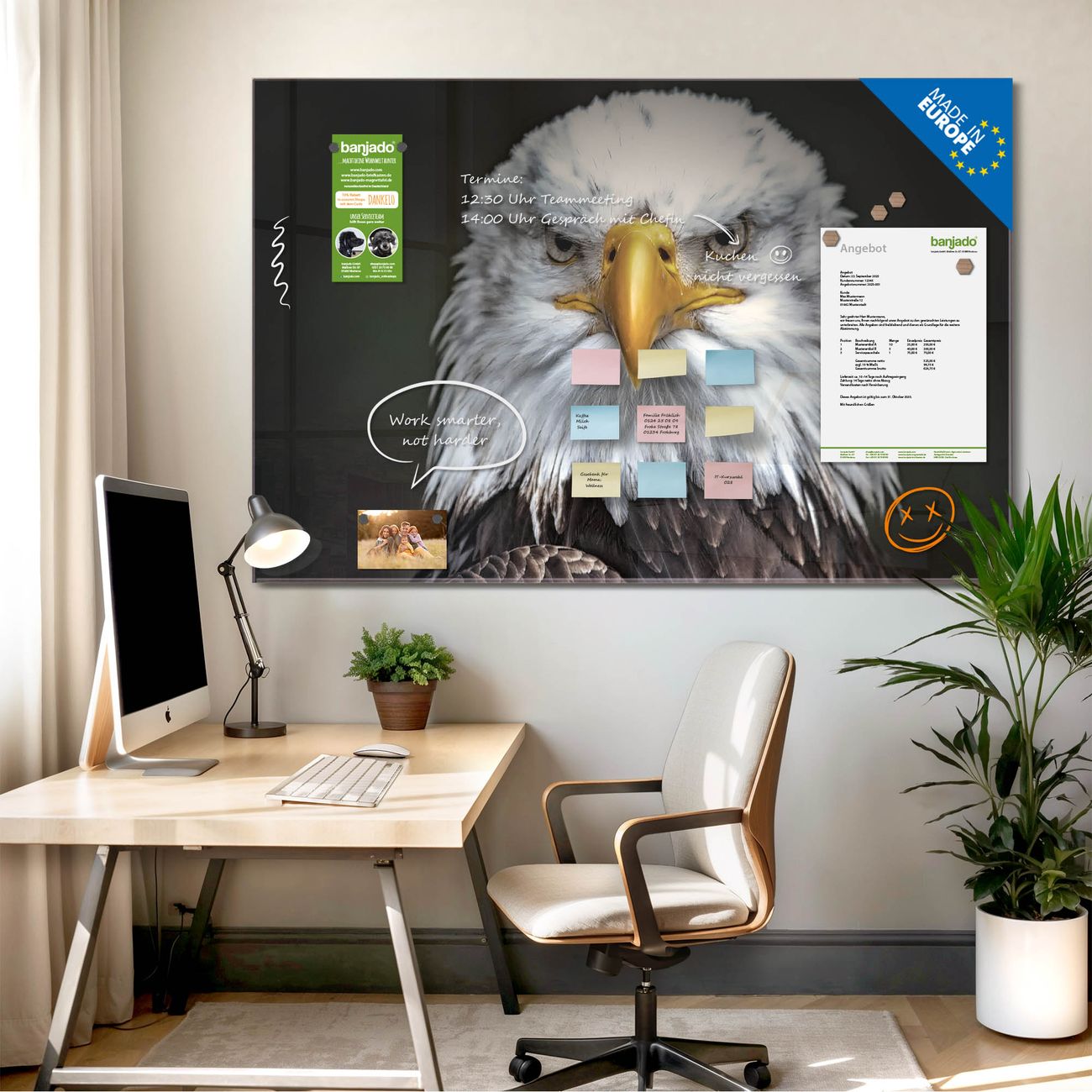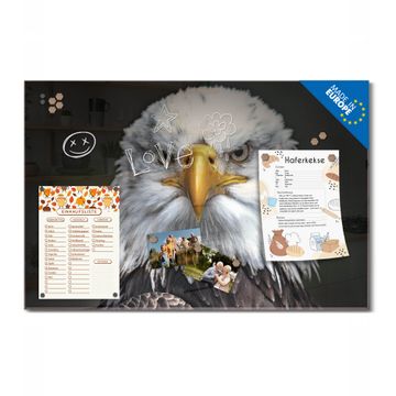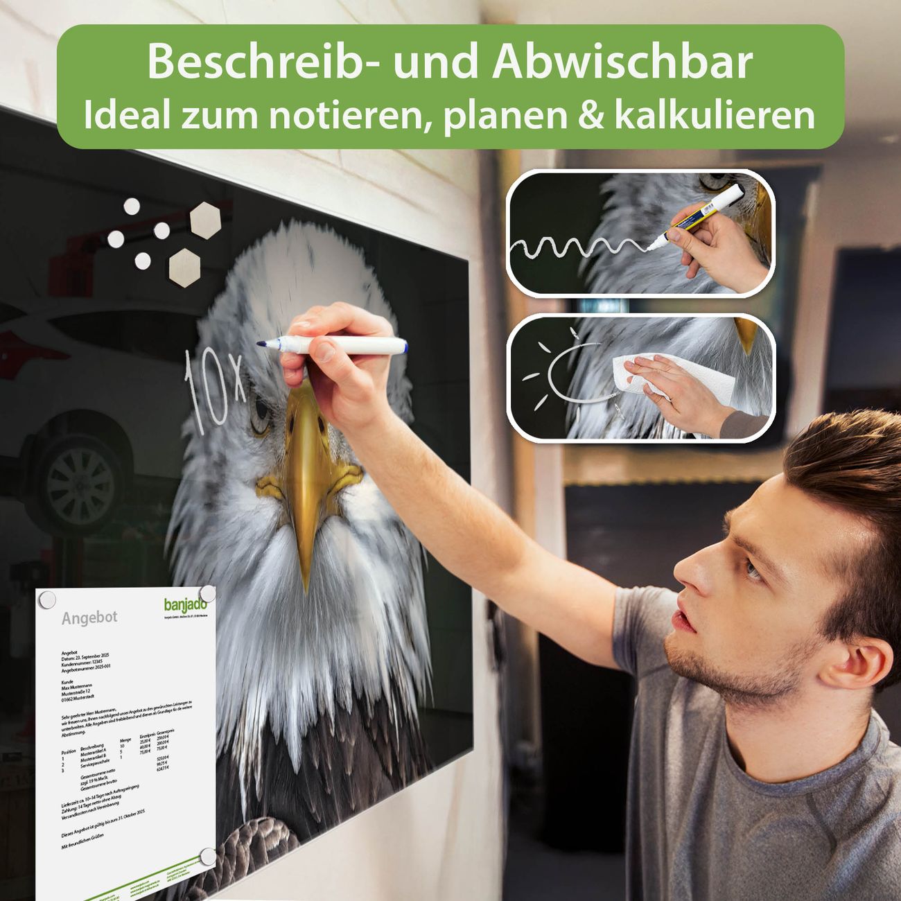 Material: 4mm Sicherheitsglas mit Metallrückwand Eigenschaften: beschreibbar, magnetisch, kratzfest Maße: 45x30x0,6cm, 2,03kg schwer Motiv Nummer 12369 Adler Zubehör: inklusive 4 Neodym-Magnete