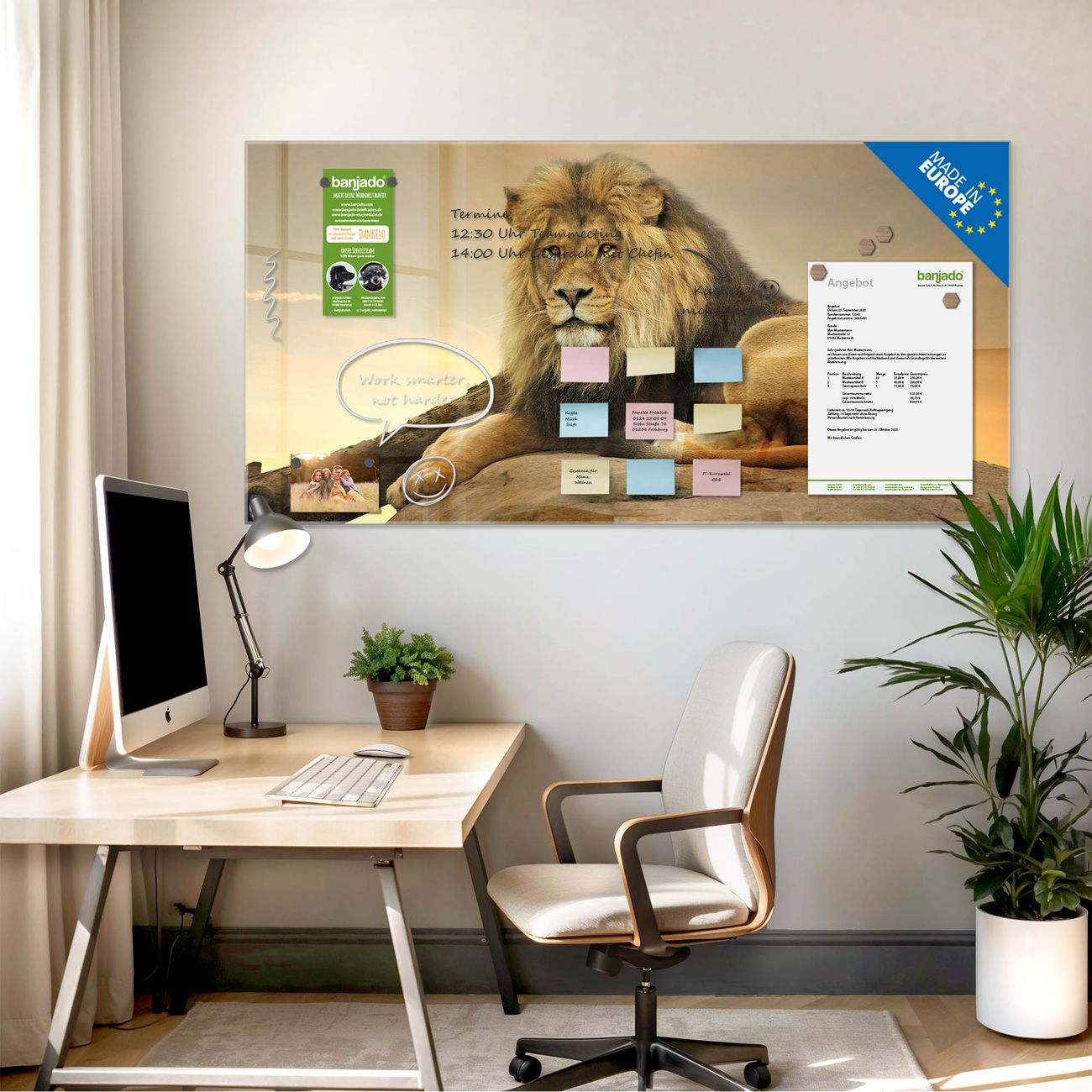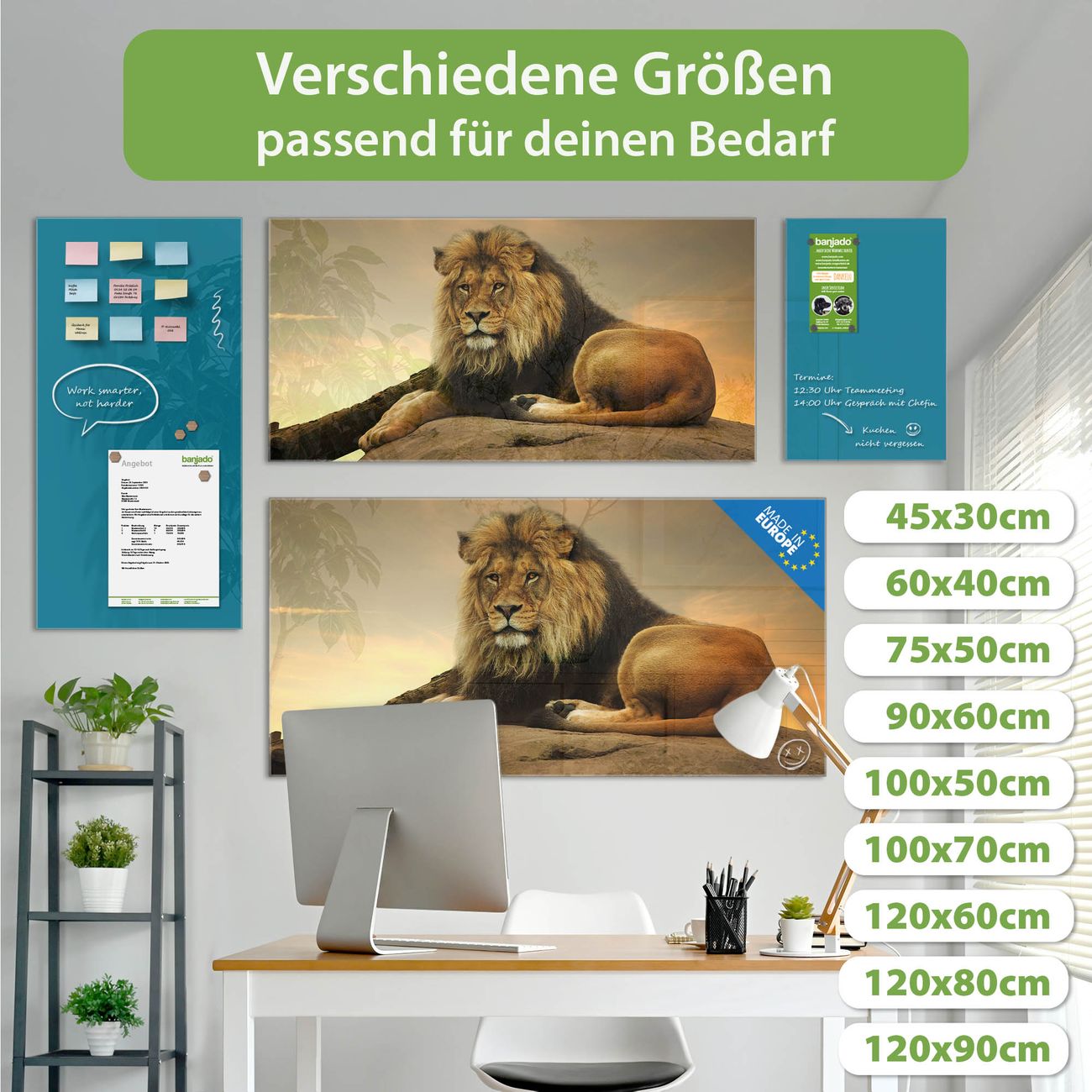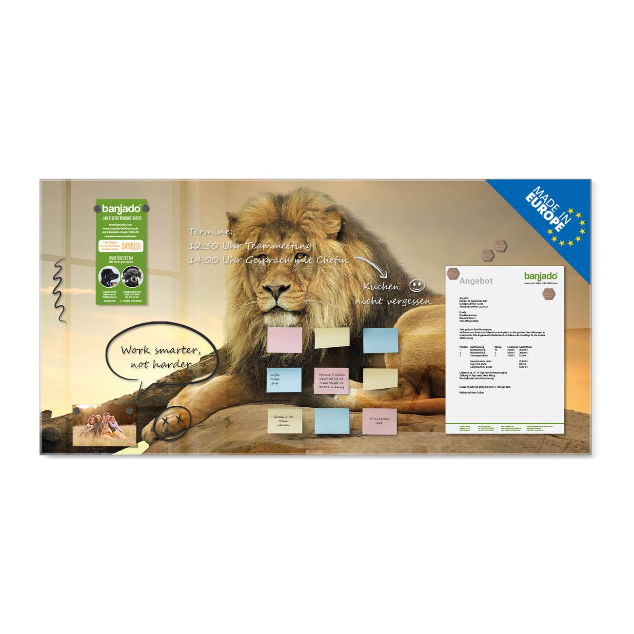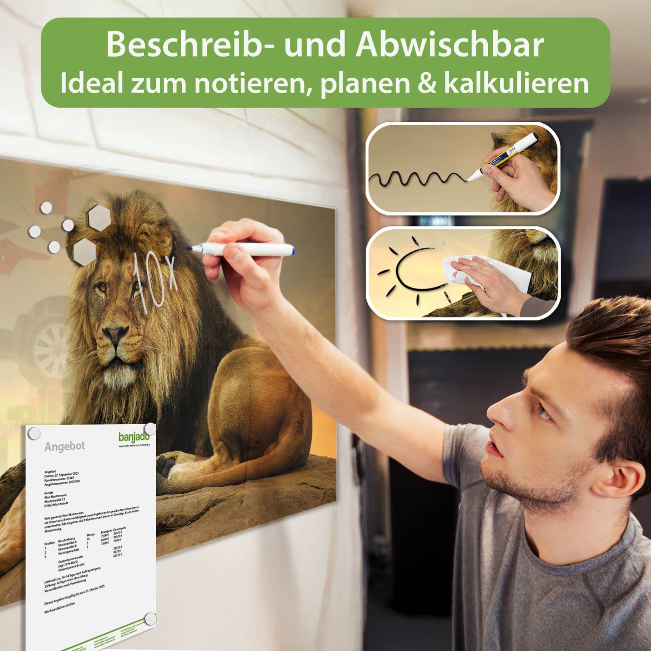 Material: 4mm Sicherheitsglas mit Metallrückwand Eigenschaften: beschreibbar, magnetisch, kratzfest Maße: 100x50x0,6cm, 7,50kg schwer Motiv Nummer 11126 Adrian Zubehör: inklusive 4 Neodym-Magnete