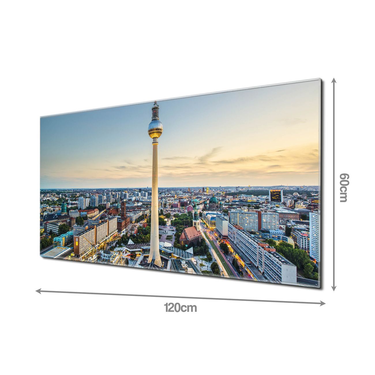 Material: 4mm Sicherheitsglas mit Metallrückwand Eigenschaften: beschreibbar, magnetisch, kratzfest Maße: 120x60x0,6cm, 10,80kg schwer Motiv Nummer 12419 Alexanderplatz Zubehör: inklusive 4 Neodym-Magnete