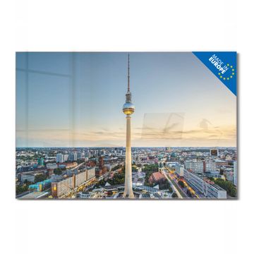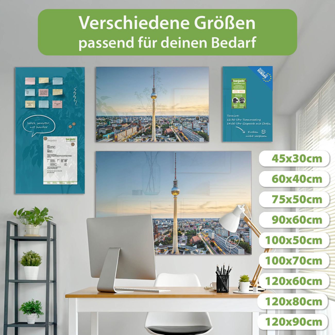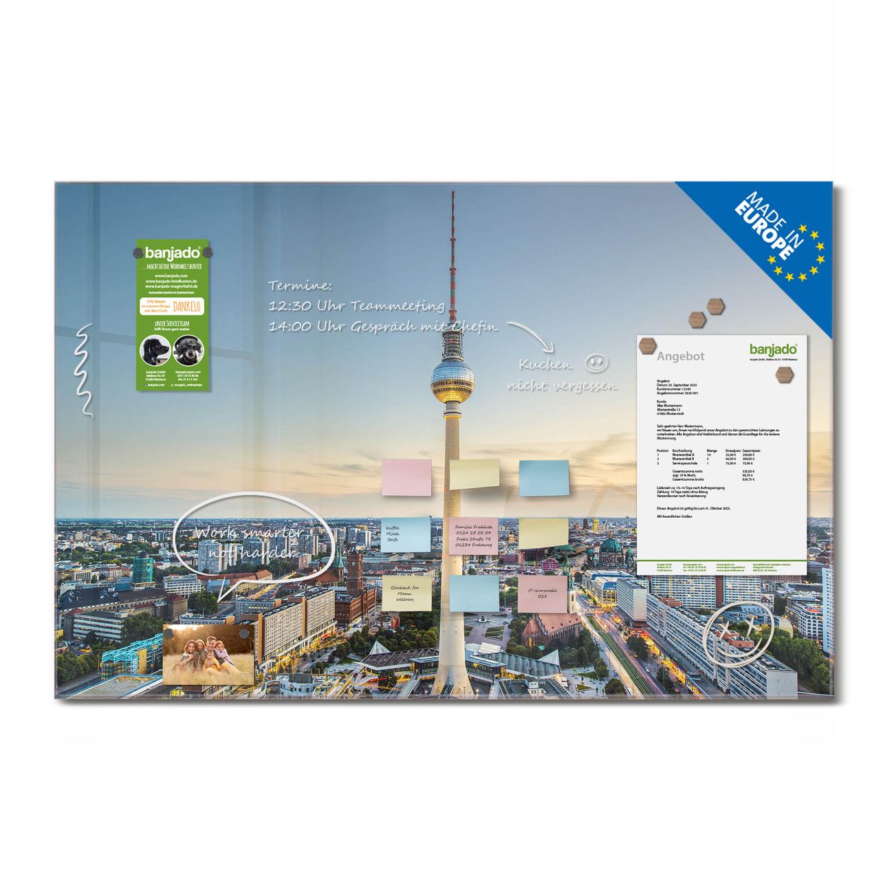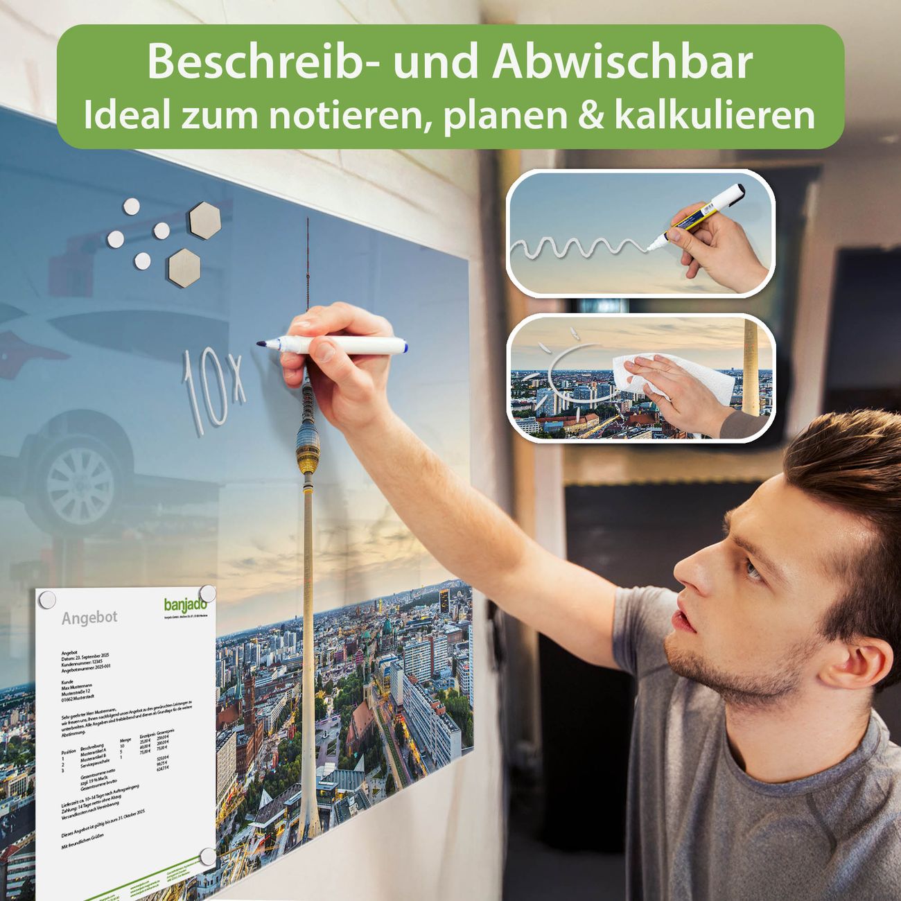 Material: 4mm Sicherheitsglas mit Metallrückwand Eigenschaften: beschreibbar, magnetisch, kratzfest Maße: 120x80x0,6cm, 14,40kg schwer Motiv Nummer 12419 Alexanderplatz Zubehör: inklusive 4 Neodym-Magnete