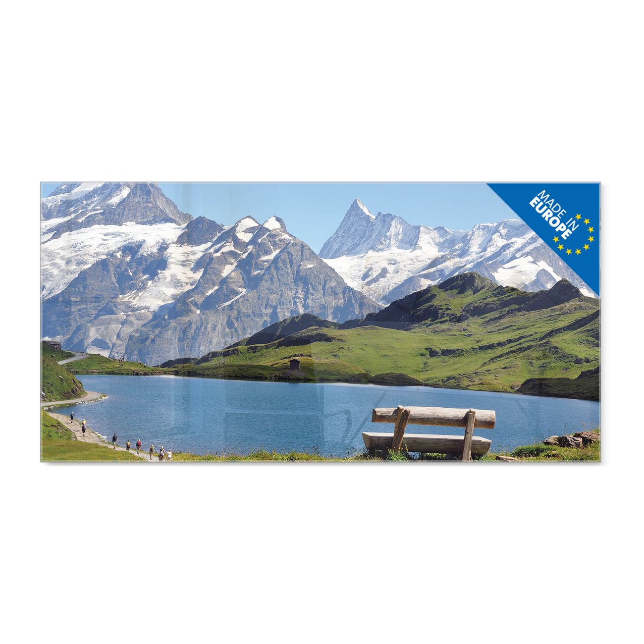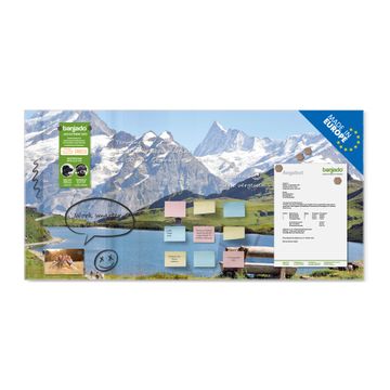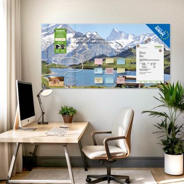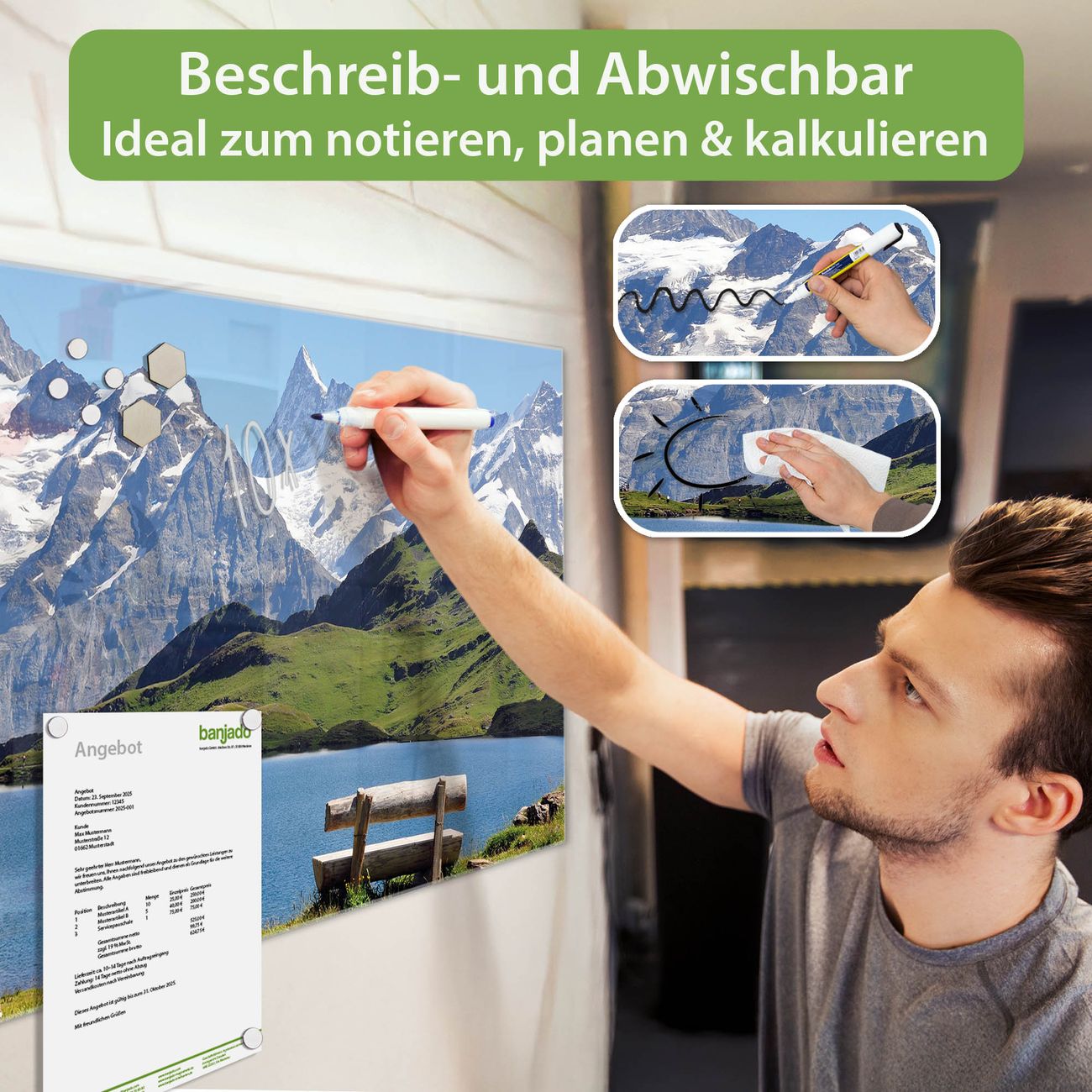 Material: 4mm Sicherheitsglas mit Metallrückwand Eigenschaften: beschreibbar, magnetisch, kratzfest Maße: 100x50x0,6cm, 7,50kg schwer Motiv Nummer 10089 Alpen Zubehör: inklusive 4 Neodym-Magnete