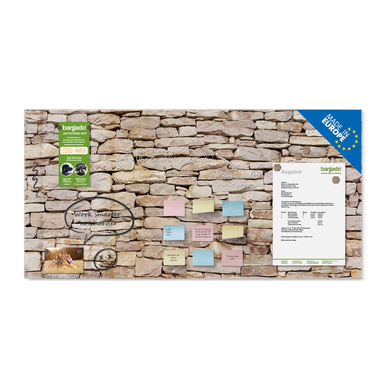 Jede Glas Magnettafel wird in unserer Werkstatt von Hand gefertigt und sorgfältig geprüft. So erhalten Sie ein echtes Qualitätsprodukt, das Funktion und Ästhetik perfekt vereint.?? Warum banjado?