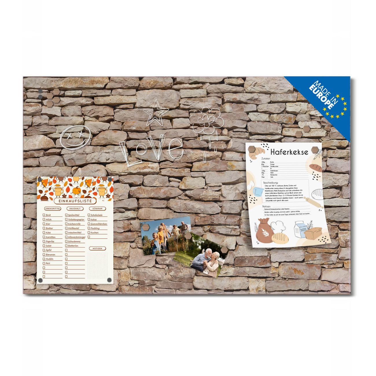 Material: 4mm Sicherheitsglas mit Metallrückwand Eigenschaften: beschreibbar, magnetisch, kratzfest Maße: 45x30x0,6cm, 2,03kg schwer Motiv Nummer 10428 Stadtmauer Zubehör: inklusive 4 Neodym-Magnete