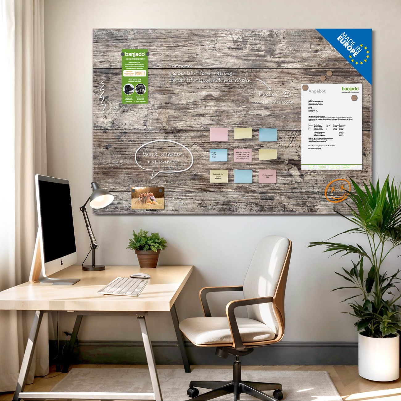 Die banjado Glas Magnettafel mit dem Motiv Motiv Alte Planken verbindet Funktionalität mit Stil. Sie ersetzt das Zettelchaos durch klare Strukturen und bringt dabei eine warme, natürliche Atmosphäre in Ihr Zuhause. Ob im Büro, in der Küche oder im Eingangsbereich - dieses Design-Board zieht Blicke an und sorgt für Ordnung mit Charakter.