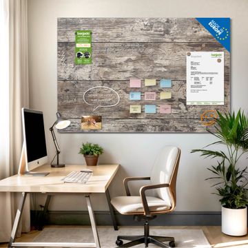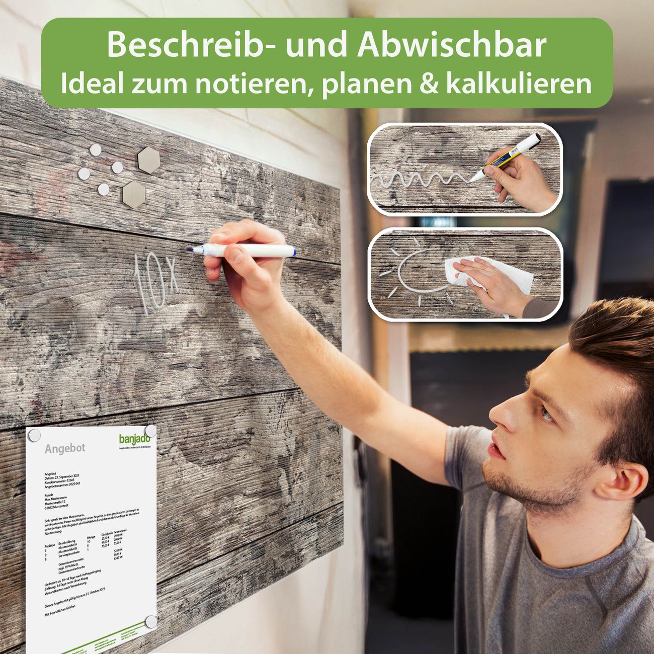 Material: 4mm Sicherheitsglas mit Metallrückwand Eigenschaften: beschreibbar, magnetisch, kratzfest Maße: 120x80x0,6cm, 14,40kg schwer Motiv Nummer 11491 Alte Planken Zubehör: inklusive 4 Neodym-Magnete