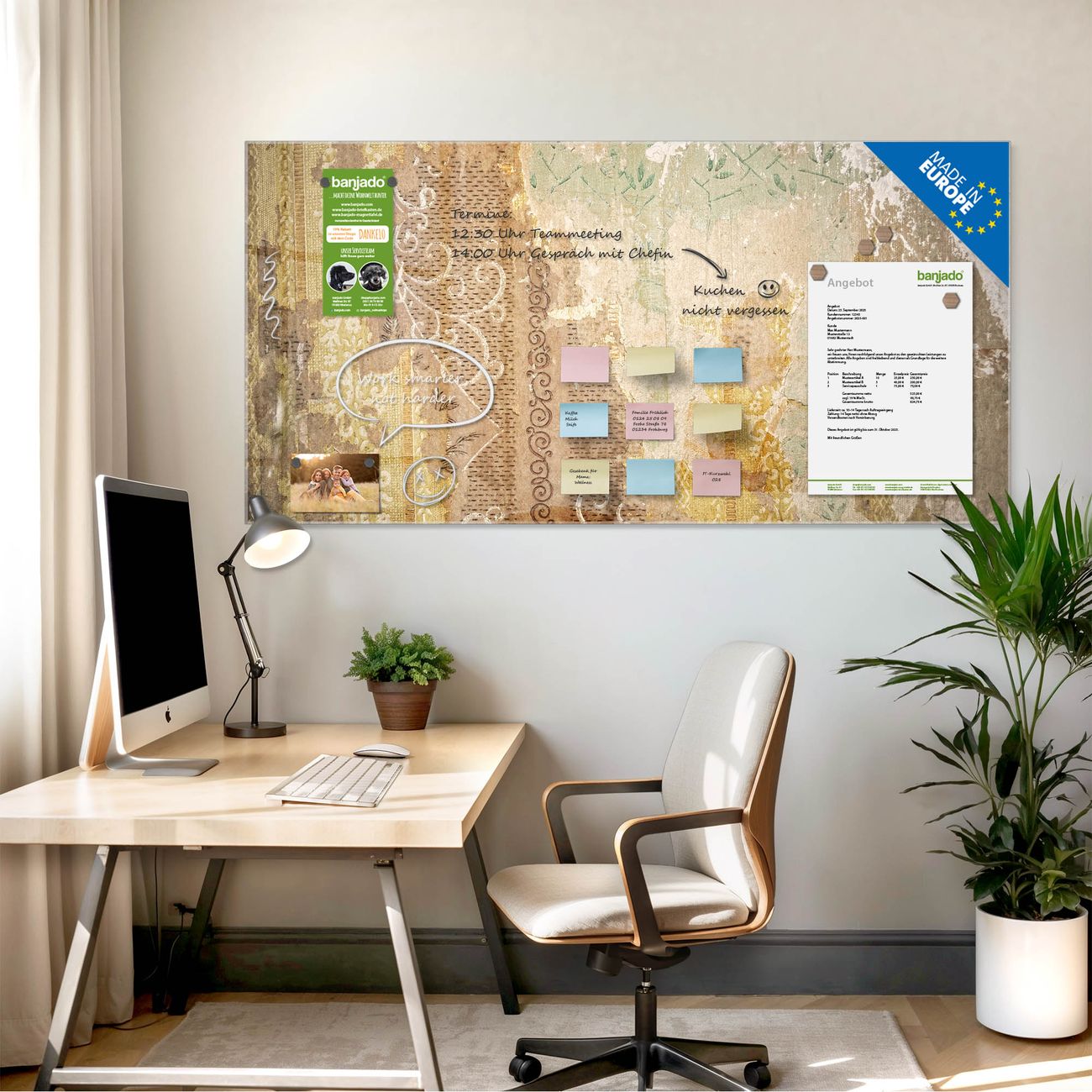 Die banjado Glas Magnettafel mit dem Motiv Motiv Alte Tapeten verbindet Funktionalität mit Stil. Sie ersetzt das Zettelchaos durch klare Strukturen und bringt dabei eine warme, natürliche Atmosphäre in Ihr Zuhause. Ob im Büro, in der Küche oder im Eingangsbereich - dieses Design-Board zieht Blicke an und sorgt für Ordnung mit Charakter.