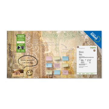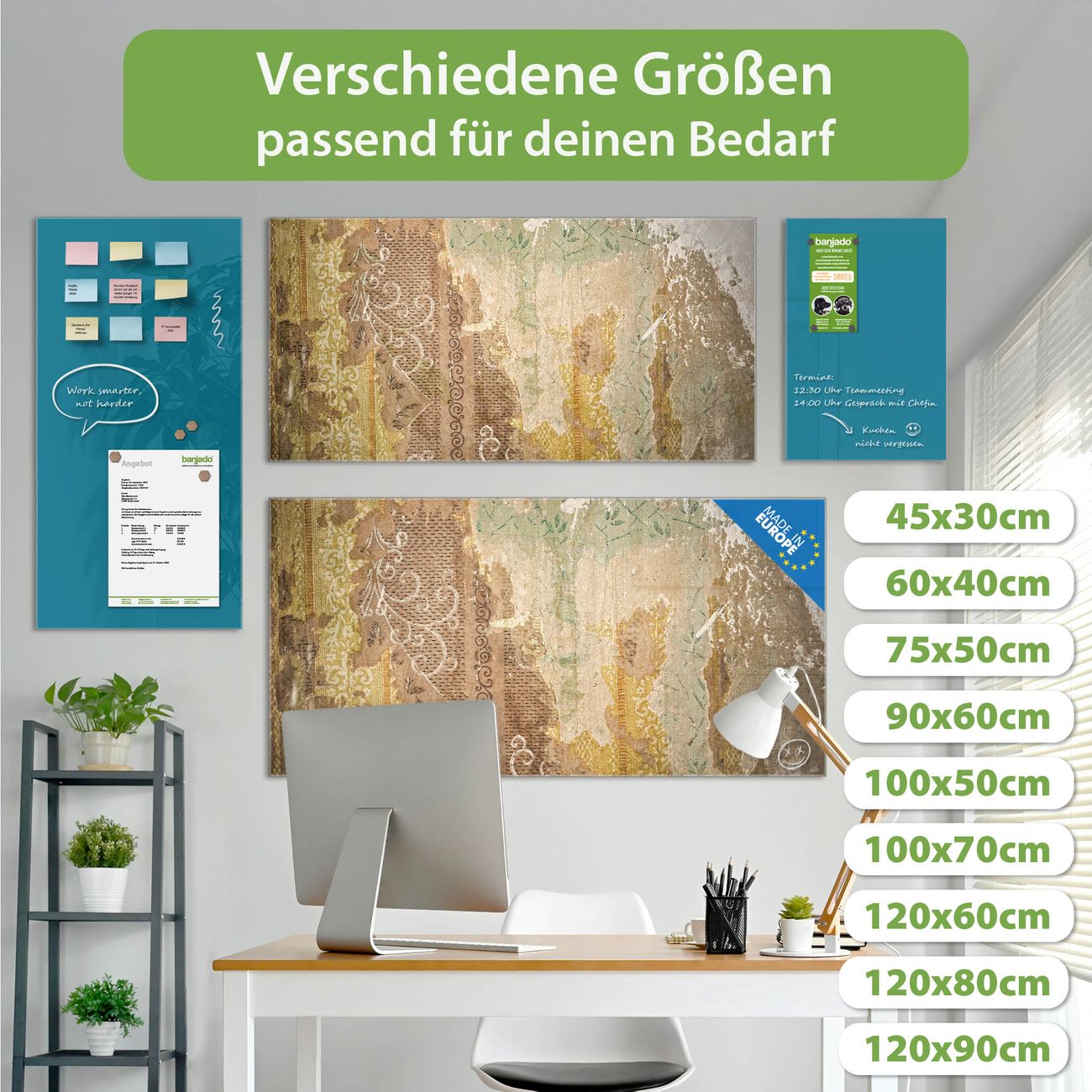 Material: 4mm Sicherheitsglas mit Metallrückwand Eigenschaften: beschreibbar, magnetisch, kratzfest Maße: 100x50x0,6cm, 7,50kg schwer Motiv Nummer 12614 Alte Tapeten Zubehör: inklusive 4 Neodym-Magnete