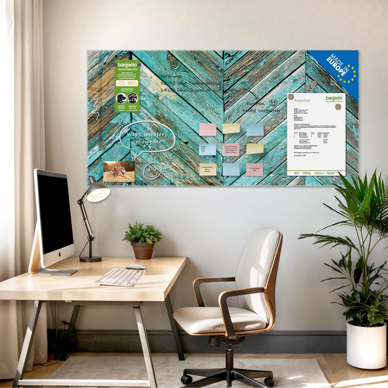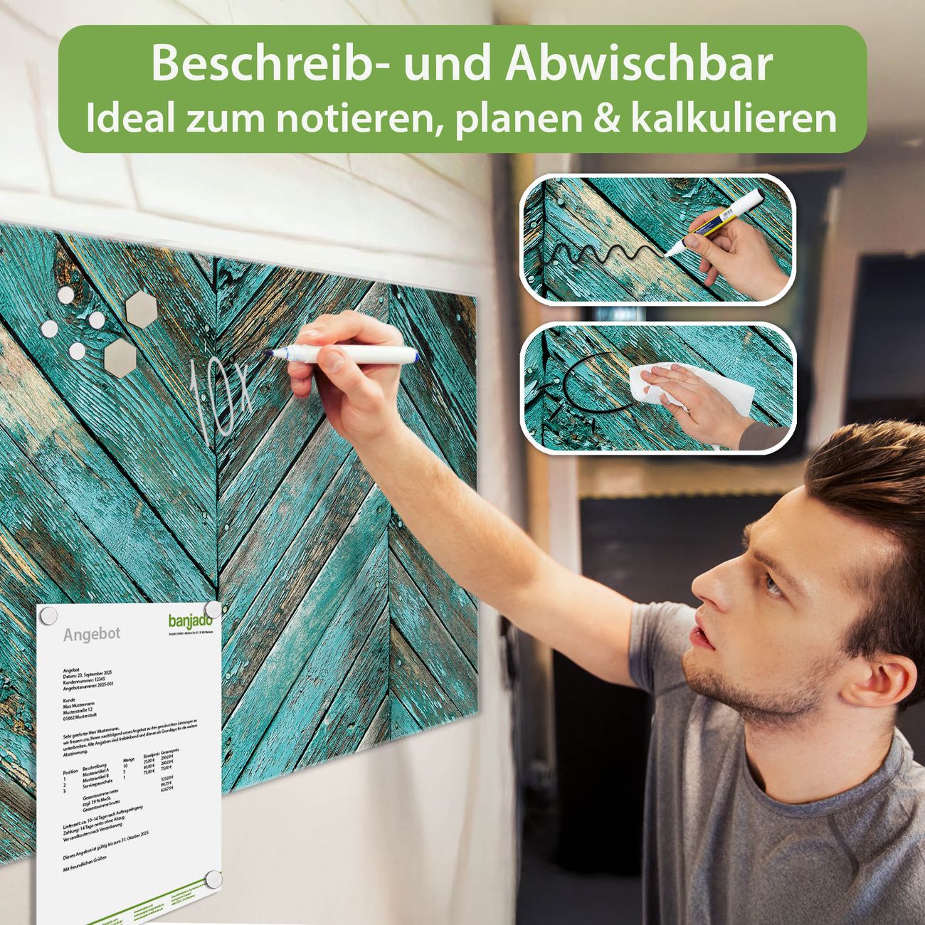 Die banjado Glas Magnettafel mit dem Motiv Motiv Altes Holz Blau verbindet Funktionalität mit Stil. Sie ersetzt das Zettelchaos durch klare Strukturen und bringt dabei eine warme, natürliche Atmosphäre in Ihr Zuhause. Ob im Büro, in der Küche oder im Eingangsbereich - dieses Design-Board zieht Blicke an und sorgt für Ordnung mit Charakter.