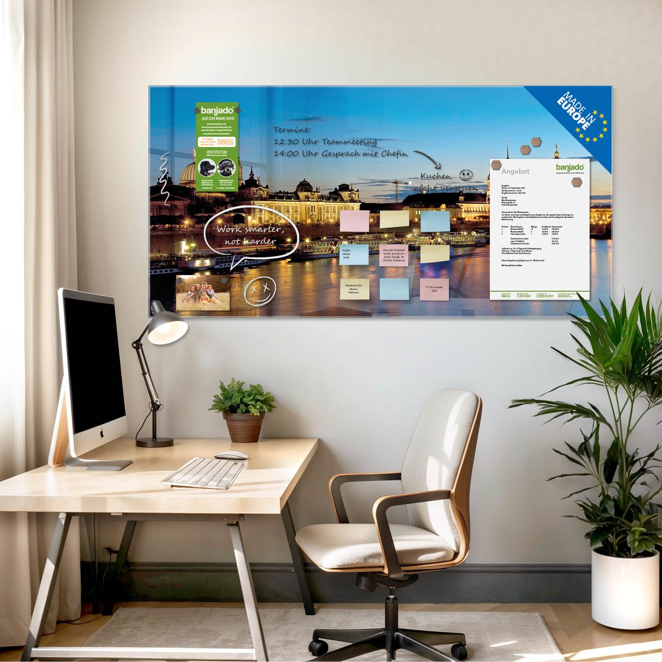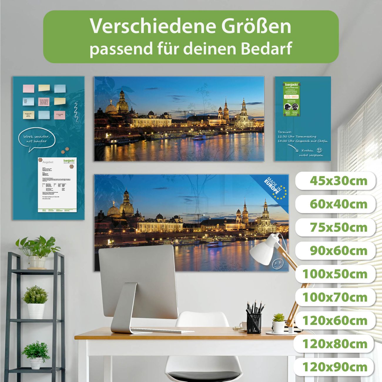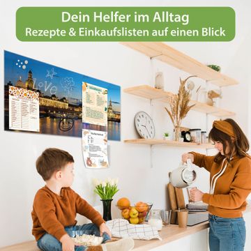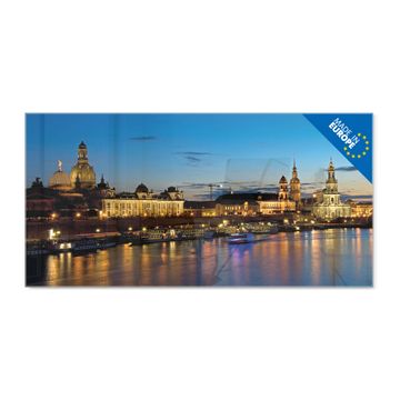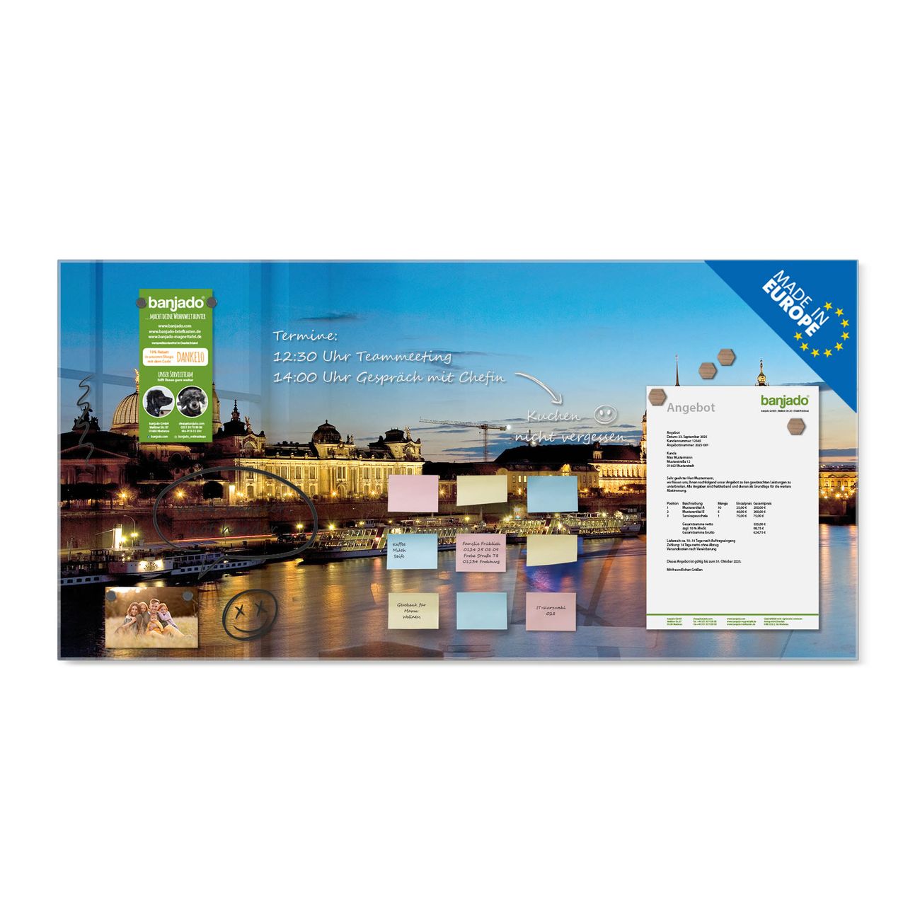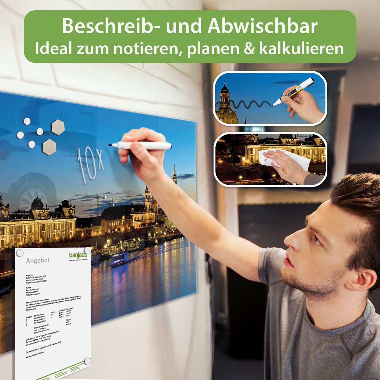 Material: 4mm Sicherheitsglas mit Metallrückwand Eigenschaften: beschreibbar, magnetisch, kratzfest Maße: 100x50x0,6cm, 7,50kg schwer Motiv Nummer 12399 Altstadt Dresden Zubehör: inklusive 4 Neodym-Magnete