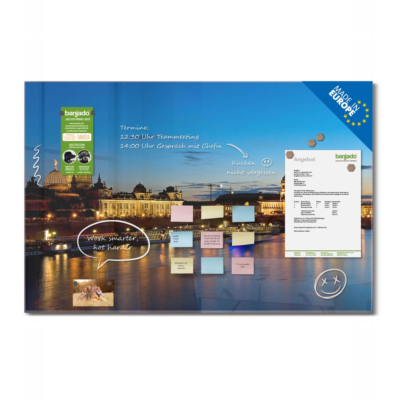 Material: 4mm Sicherheitsglas mit Metallrückwand Eigenschaften: beschreibbar, magnetisch, kratzfest Maße: 120x80x0,6cm, 14,40kg schwer Motiv Nummer 12399 Altstadt Dresden Zubehör: inklusive 4 Neodym-Magnete