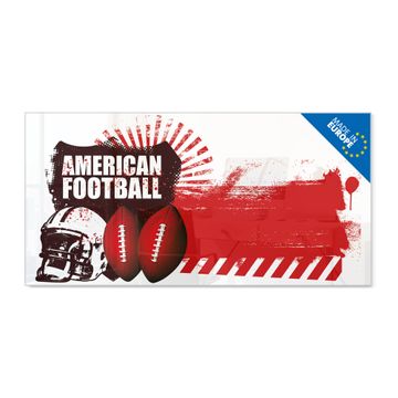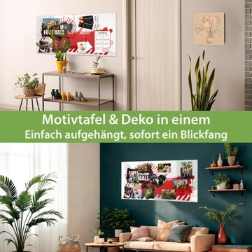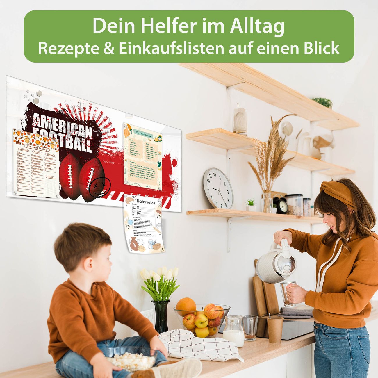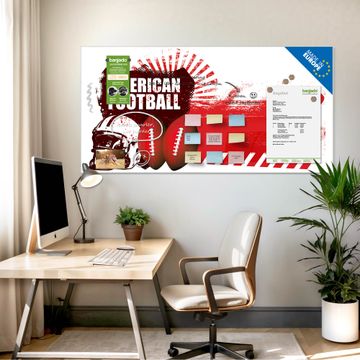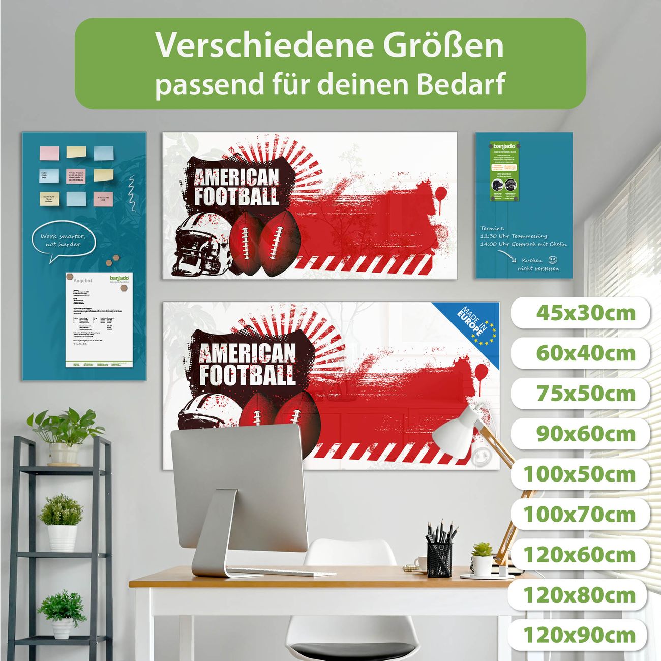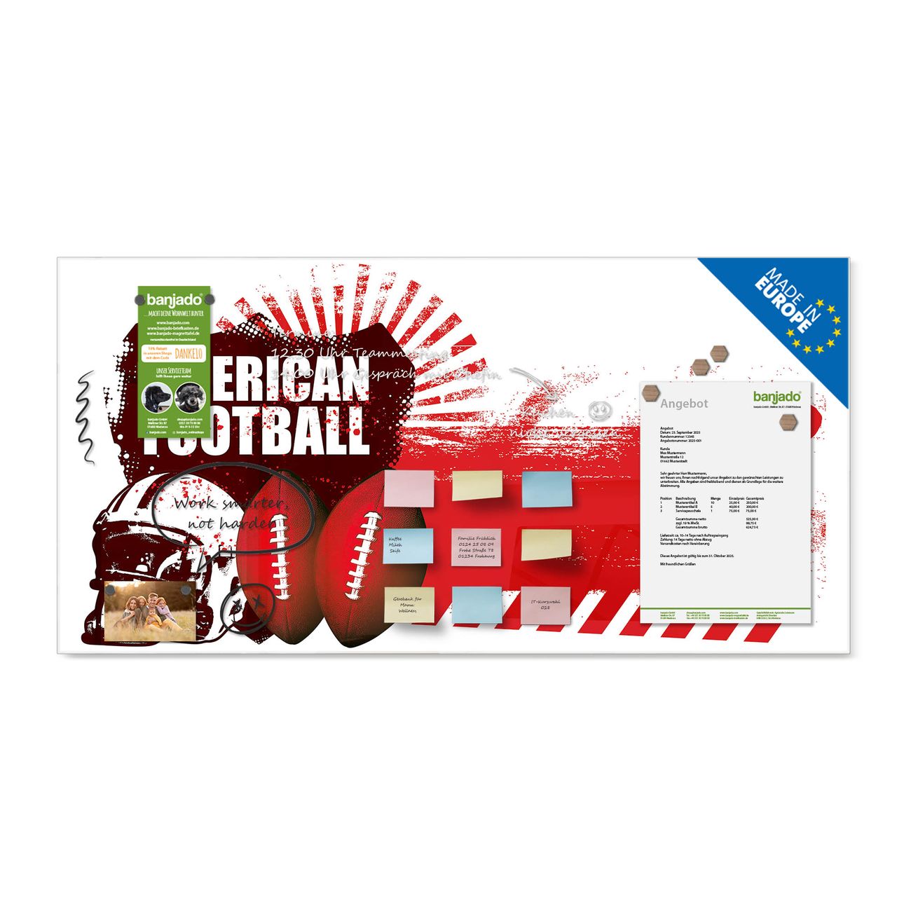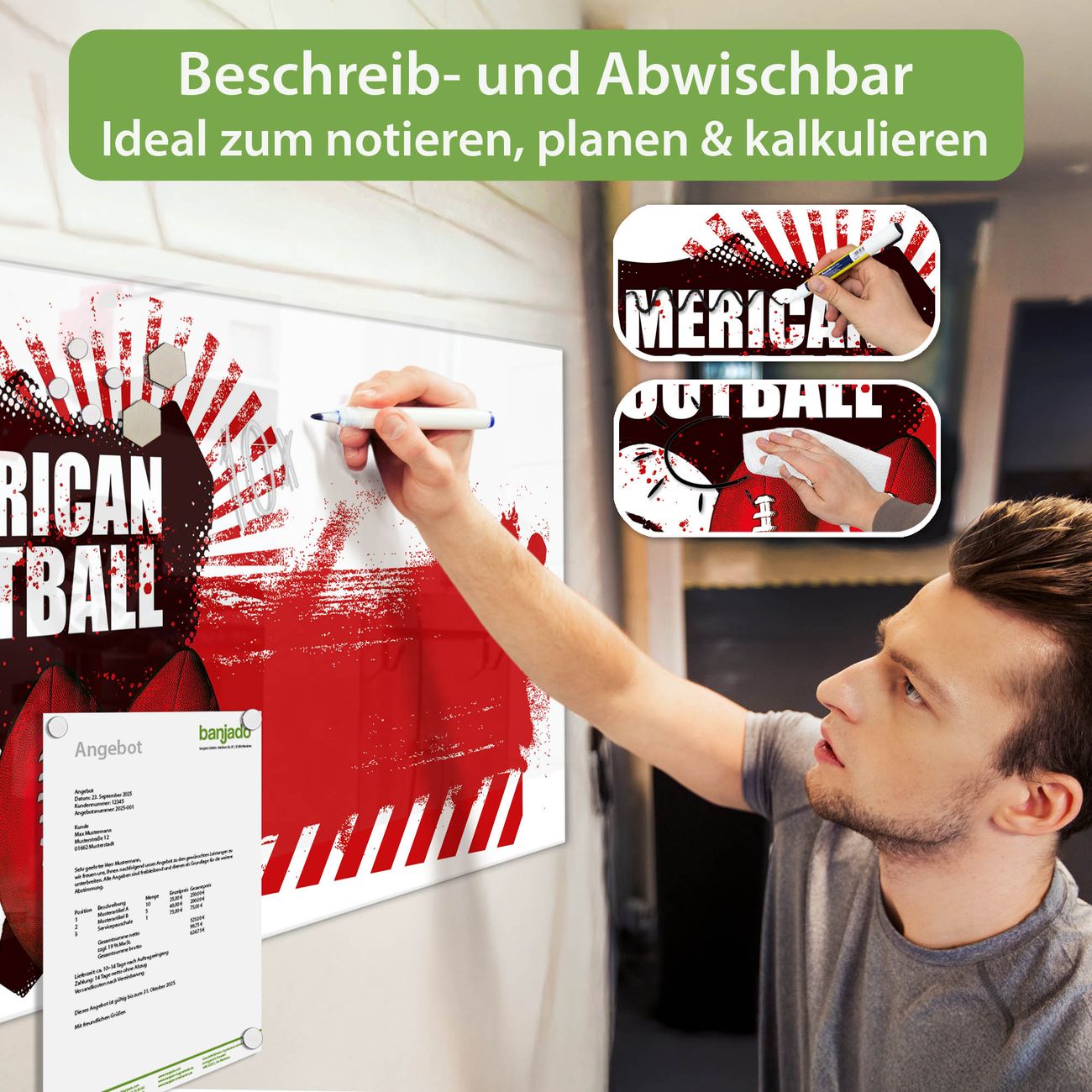 Material: 4mm Sicherheitsglas mit Metallrückwand Eigenschaften: beschreibbar, magnetisch, kratzfest Maße: 100x50x0,6cm, 7,50kg schwer Motiv Nummer 11148 American Football Zubehör: inklusive 4 Neodym-Magnete