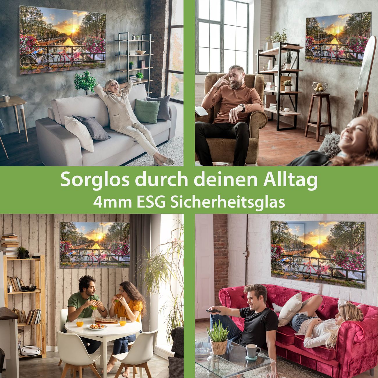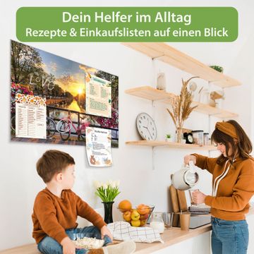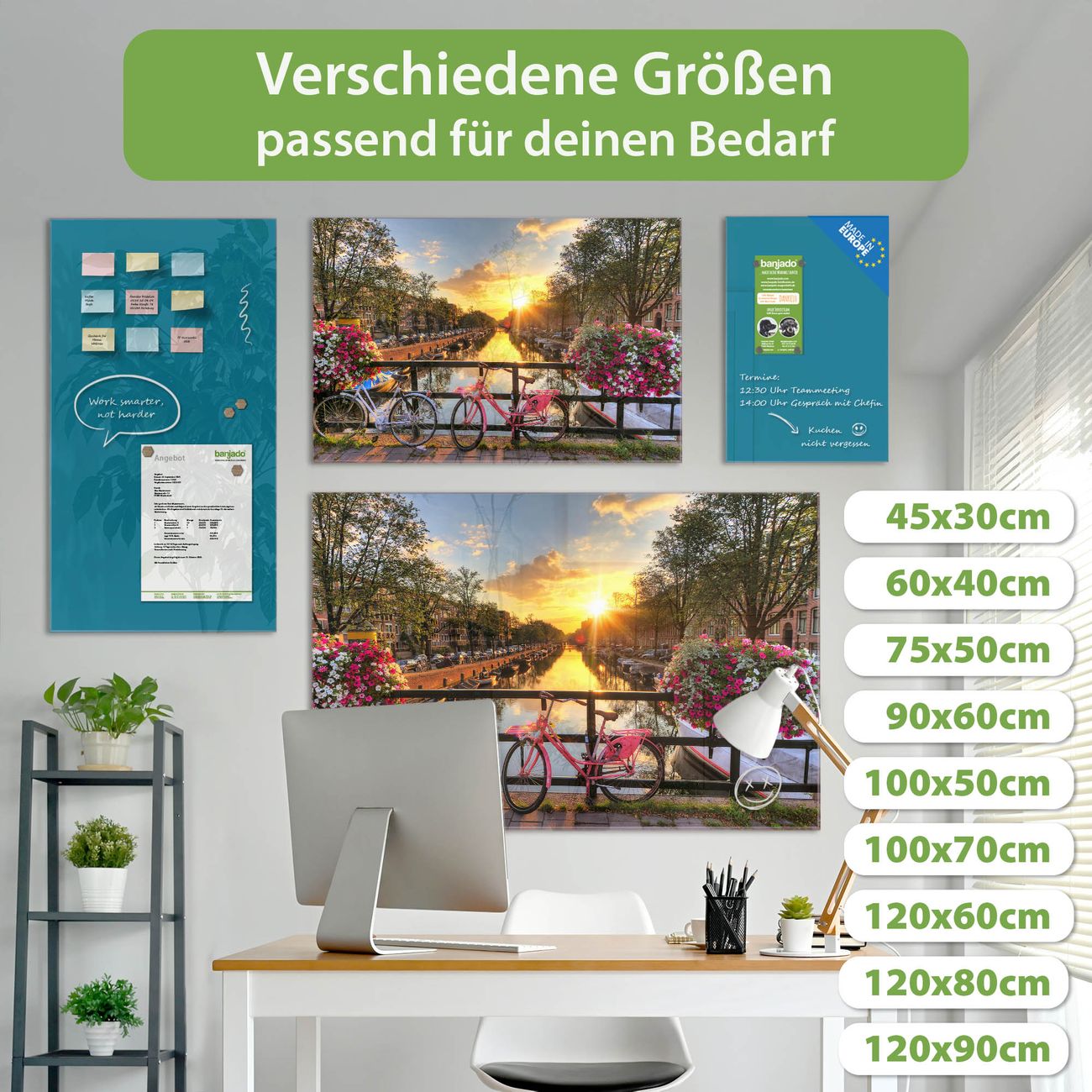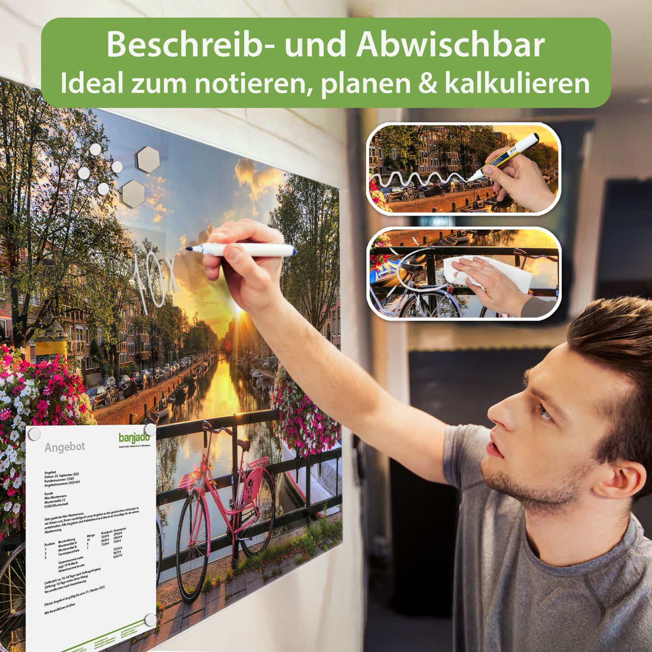 Material: 4mm Sicherheitsglas mit Metallrückwand Eigenschaften: beschreibbar, magnetisch, kratzfest Maße: 120x80x0,6cm, 14,40kg schwer Motiv Nummer 12683 Amsterdam Mit Rad Zubehör: inklusive 4 Neodym-Magnete