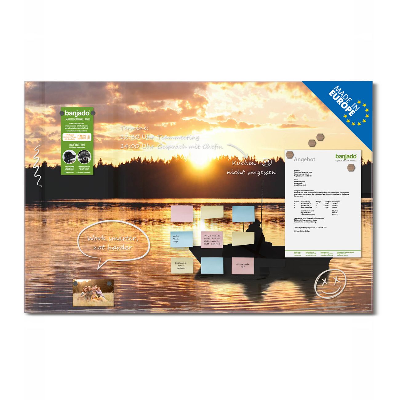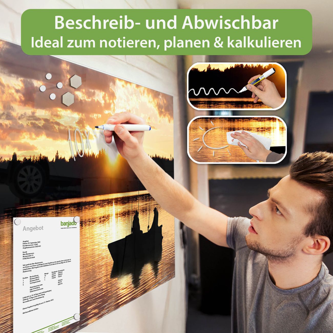 Jede Glas Magnettafel wird in unserer Werkstatt von Hand gefertigt und sorgfältig geprüft. So erhalten Sie ein echtes Qualitätsprodukt, das Funktion und Ästhetik perfekt vereint.?? Warum banjado?
