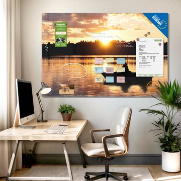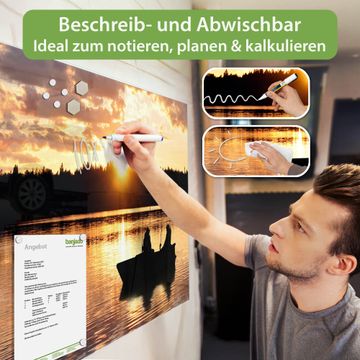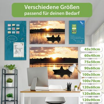 Material: 4mm Sicherheitsglas mit Metallrückwand Eigenschaften: beschreibbar, magnetisch, kratzfest Maße: 90x60x0,6cm, 8,10kg schwer Motiv Nummer 10554 Angler Zubehör: inklusive 4 Neodym-Magnete