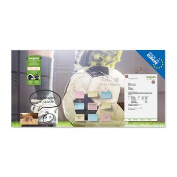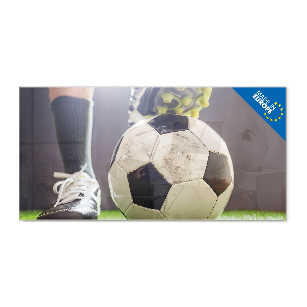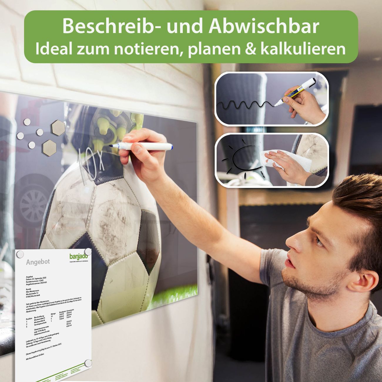 Material: 4mm Sicherheitsglas mit Metallrückwand Eigenschaften: beschreibbar, magnetisch, kratzfest Maße: 100x50x0,6cm, 7,50kg schwer Motiv Nummer 10810 Anpfiff Zubehör: inklusive 4 Neodym-Magnete
