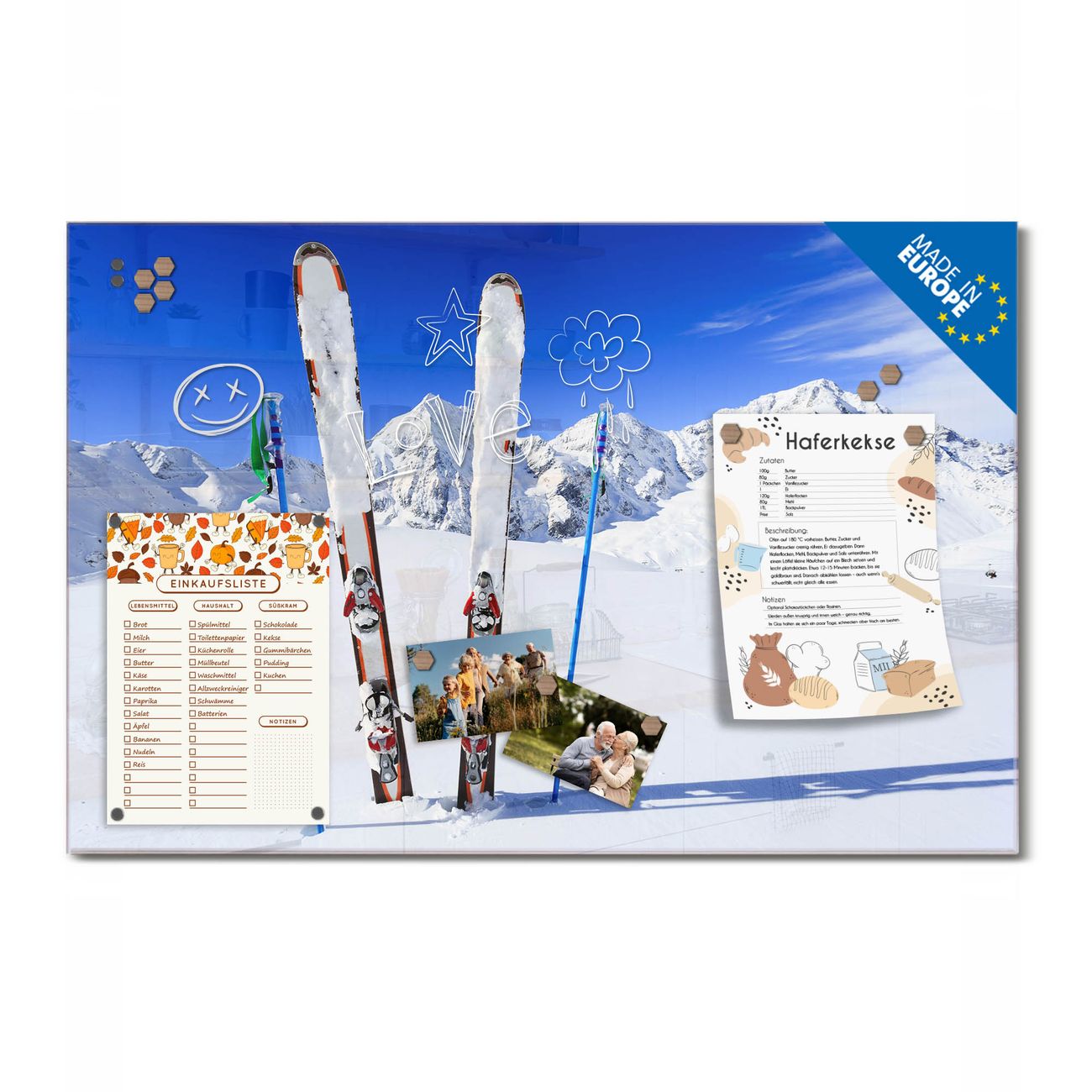 Material: 4mm Sicherheitsglas mit Metallrückwand Eigenschaften: beschreibbar, magnetisch, kratzfest Maße: 75x50x0,6cm, 5,63kg schwer Motiv Nummer 11150 Apres Ski Zubehör: inklusive 4 Neodym-Magnete