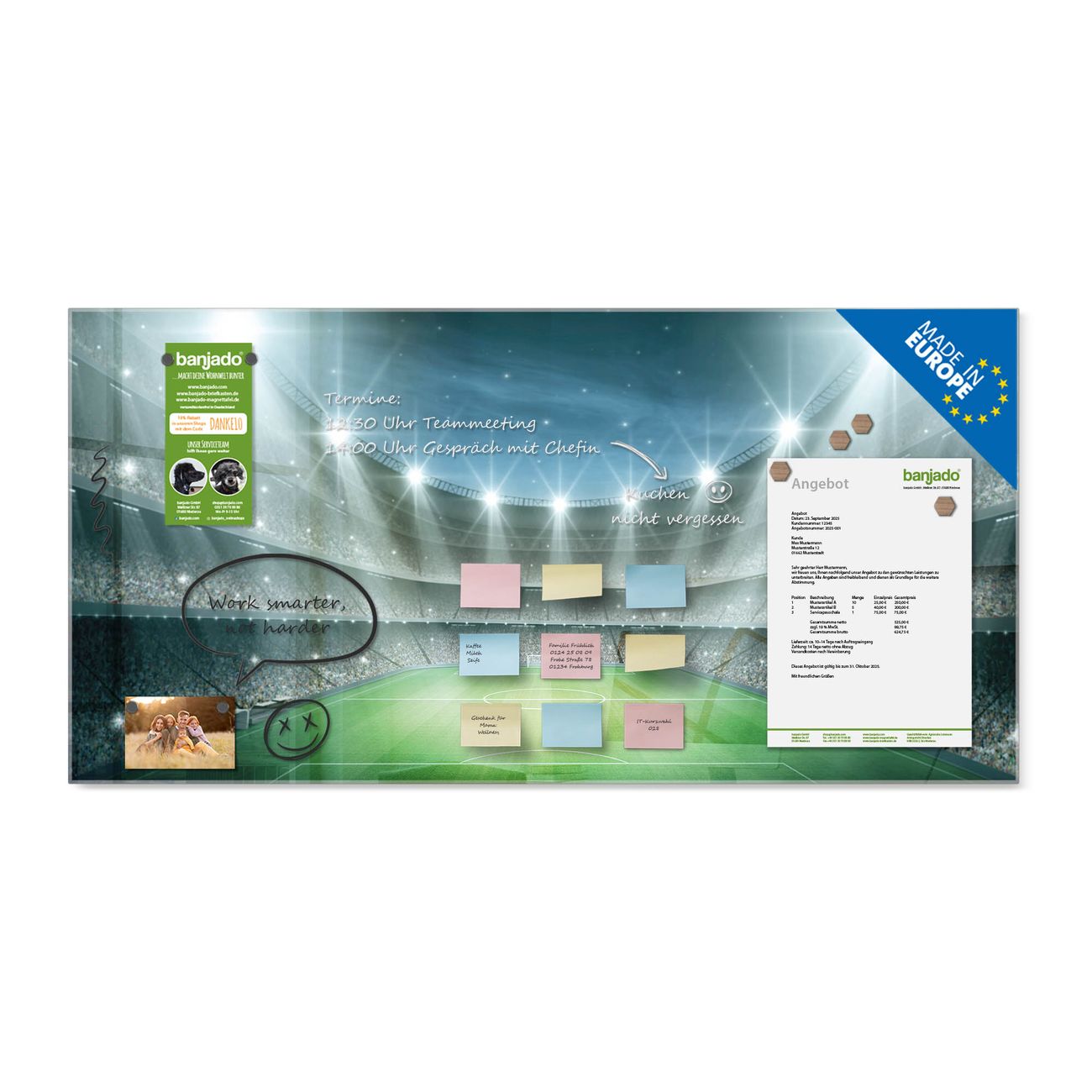 Ein Stück Design, das Ihren Alltag organisiert. Schreiben, heften, inspirieren - alles an einem Ort. Qualität, die man spürt. Montage leicht gemacht. Handwerk mit Herz - veredelt in Sachsen. Einzigartiges Design mit Motiv Motiv Arena Beschreibbare Glasoberfläche, leicht zu reinigen Starke Magnetkraft durch Stahlrückwand Inklusive 4 Neodym-Magneten Flexible Montageoptionen Handveredelt in Sachsen - Qualität, die bleibt