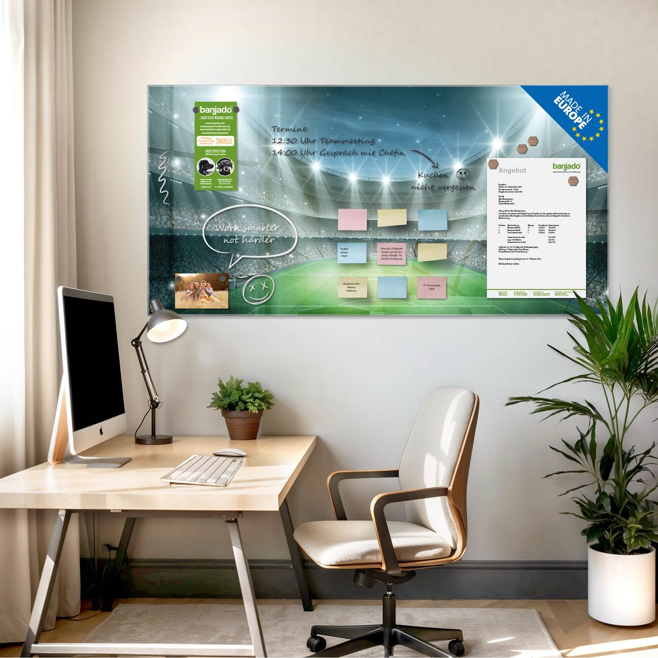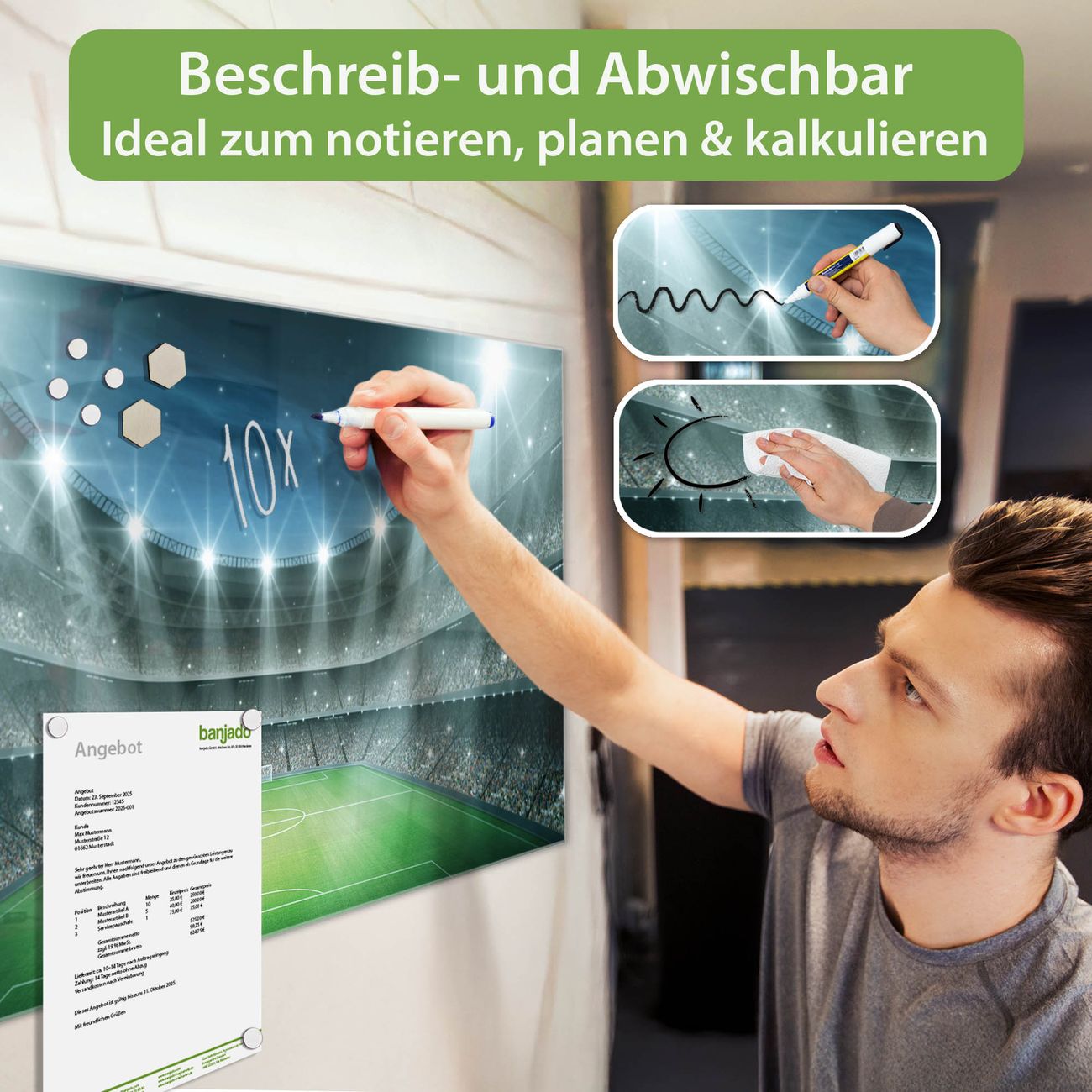 Jede Glas Magnettafel wird in unserer Werkstatt von Hand gefertigt und sorgfältig geprüft. So erhalten Sie ein echtes Qualitätsprodukt, das Funktion und Ästhetik perfekt vereint.?? Warum banjado?