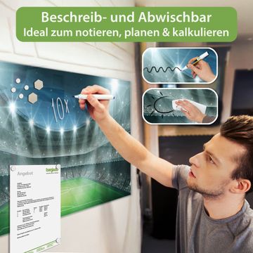 Material: 4mm Sicherheitsglas mit Metallrückwand Eigenschaften: beschreibbar, magnetisch, kratzfest Maße: 120x60x0,6cm, 10,80kg schwer Motiv Nummer 10875 Arena Zubehör: inklusive 4 Neodym-Magnete