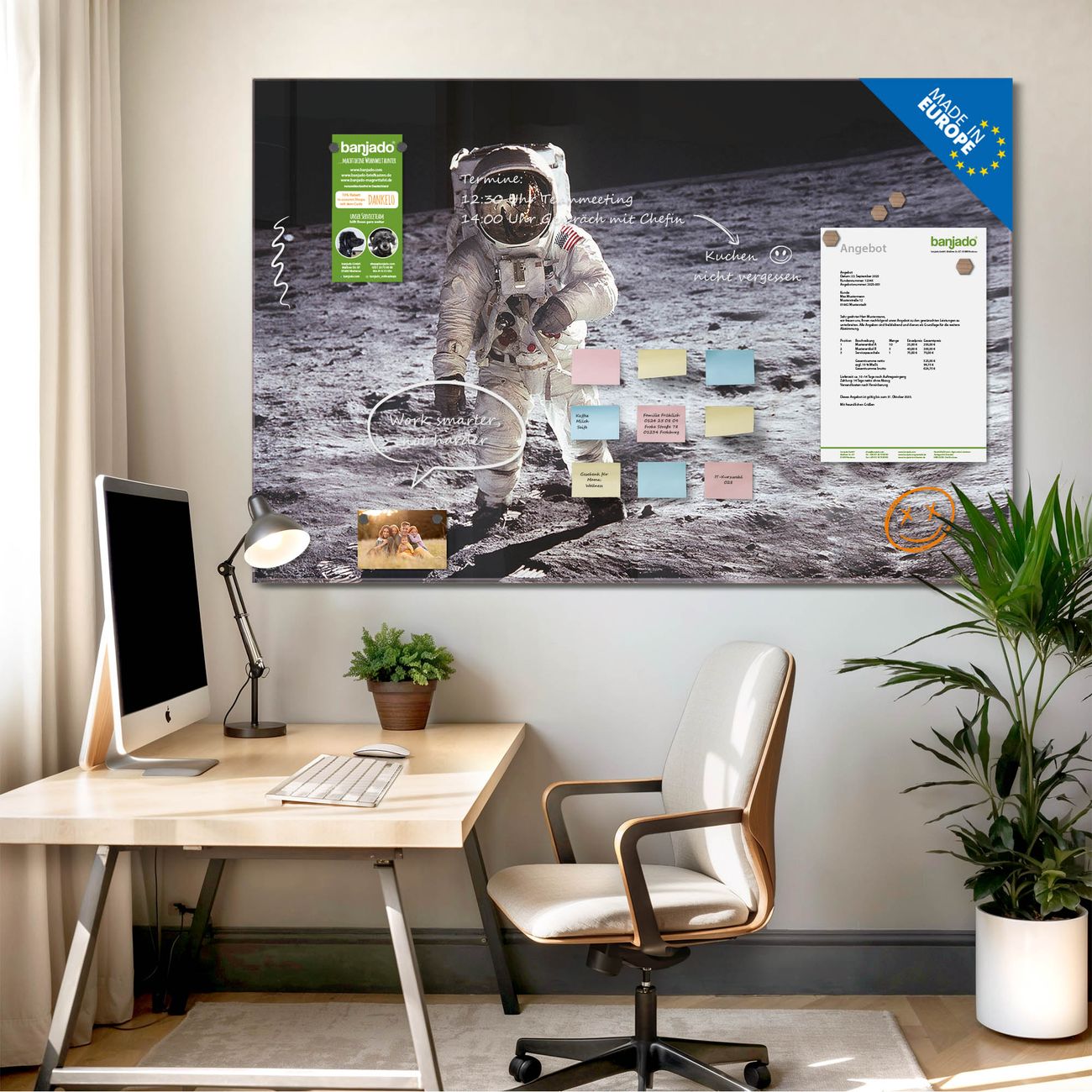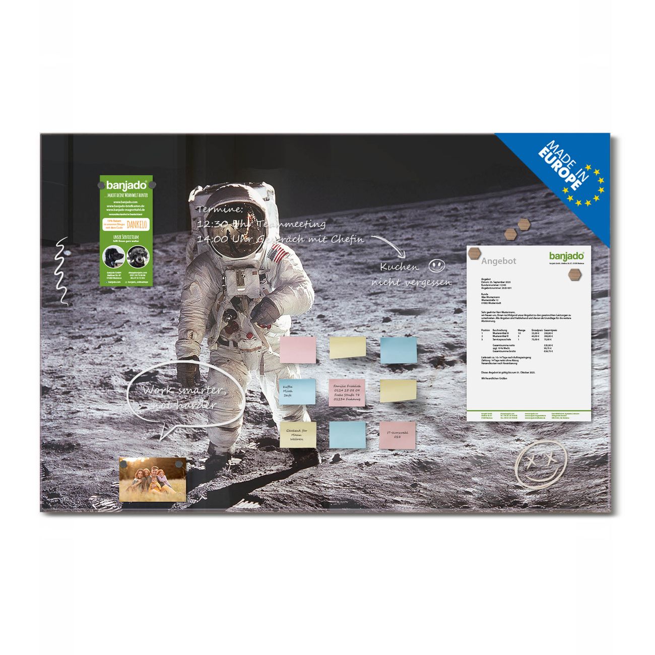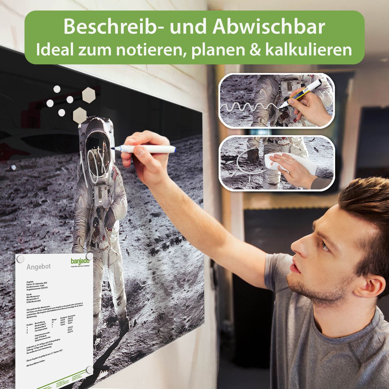 Material: 4mm Sicherheitsglas mit Metallrückwand Eigenschaften: beschreibbar, magnetisch, kratzfest Maße: 120x80x0,6cm, 14,40kg schwer Motiv Nummer 10453 Astronaut Zubehör: inklusive 4 Neodym-Magnete