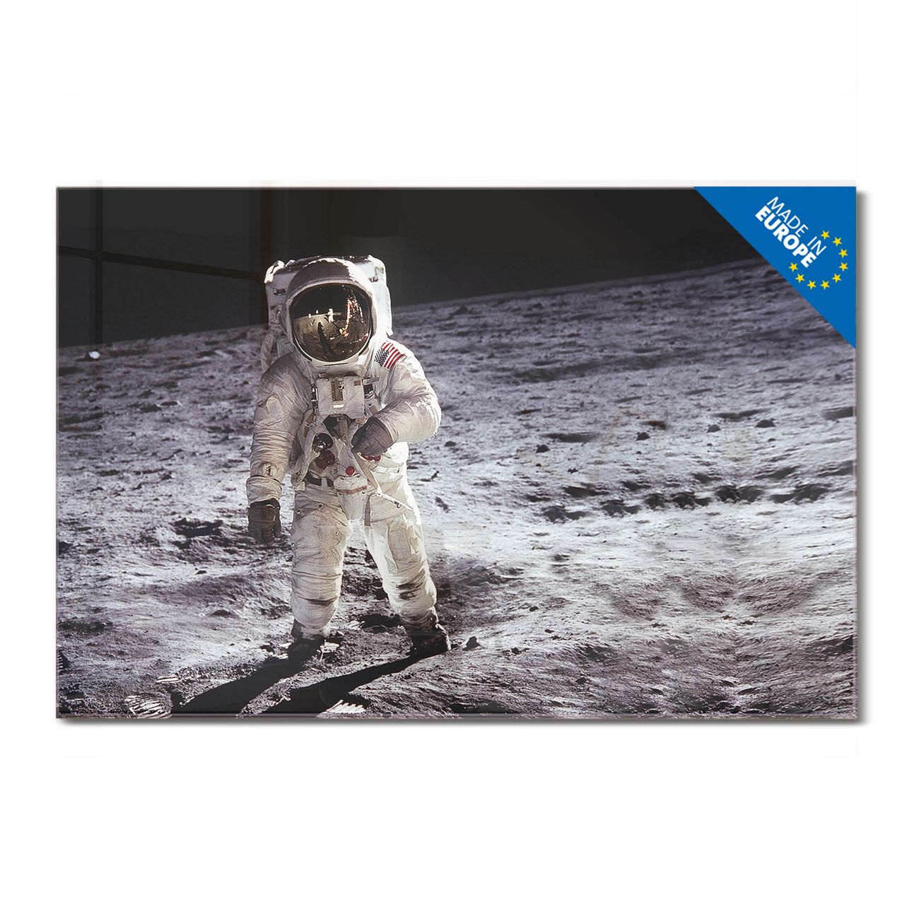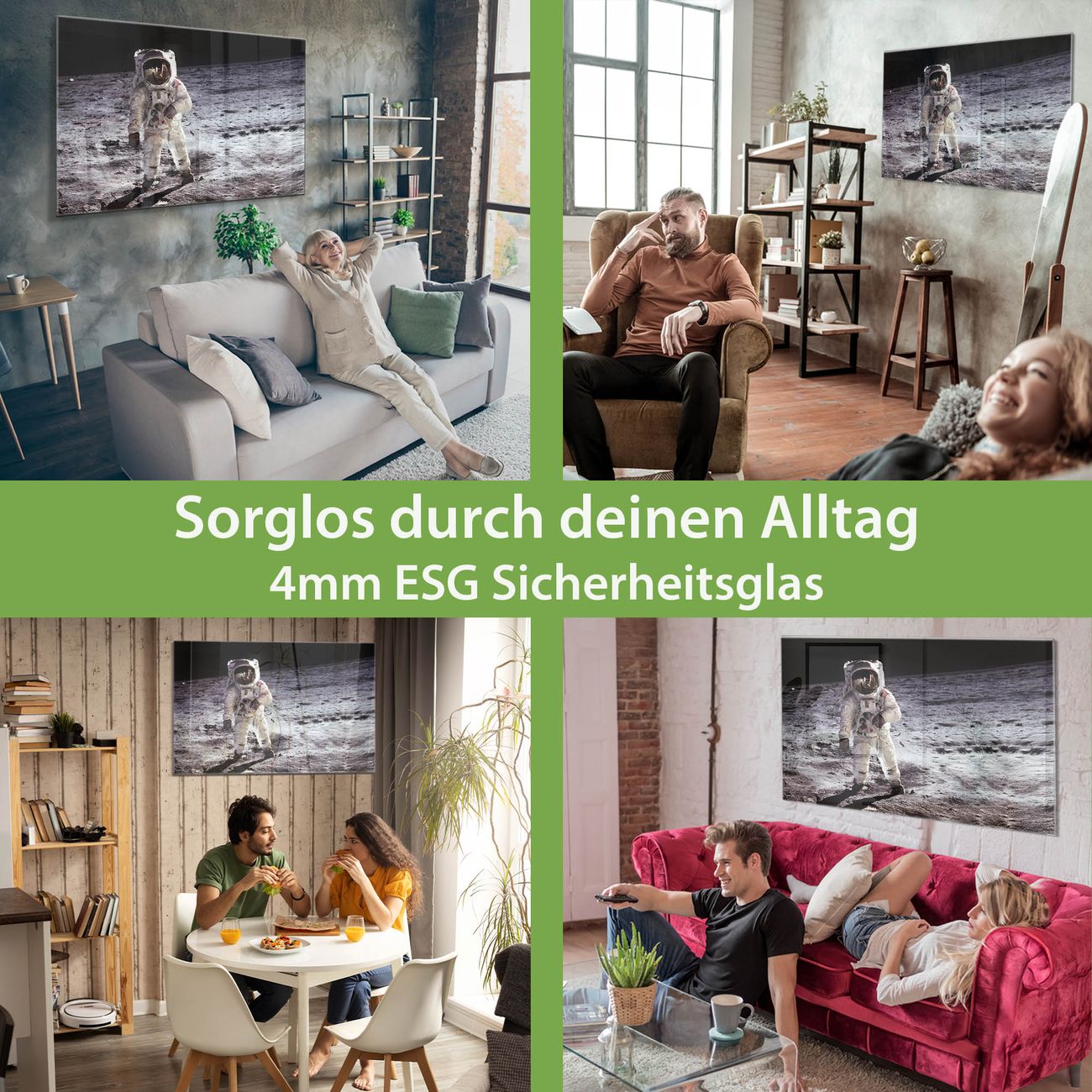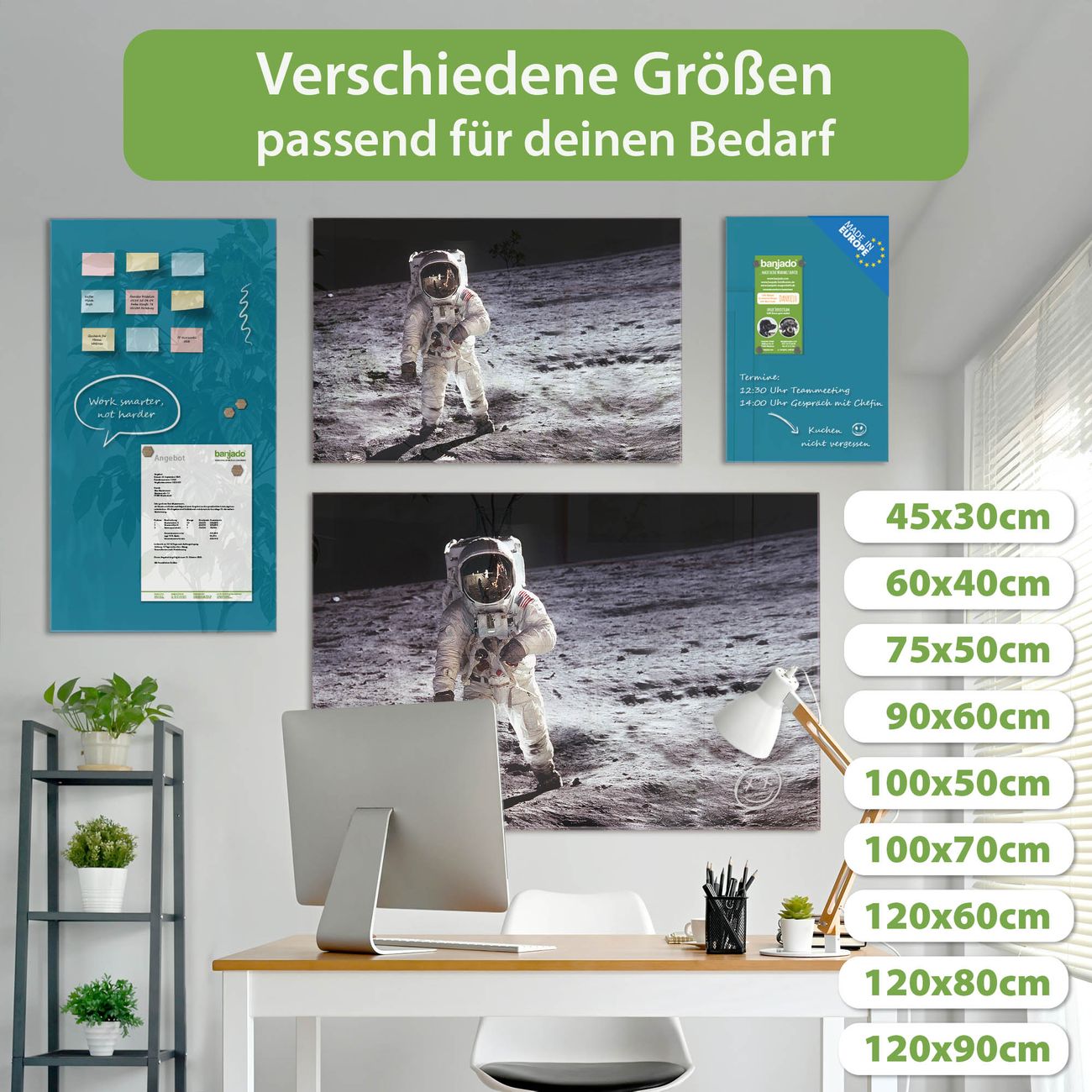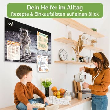 Material: 4mm Sicherheitsglas mit Metallrückwand Eigenschaften: beschreibbar, magnetisch, kratzfest Maße: 120x80x0,6cm, 14,40kg schwer Motiv Nummer 10453 Astronaut Zubehör: inklusive 4 Neodym-Magnete