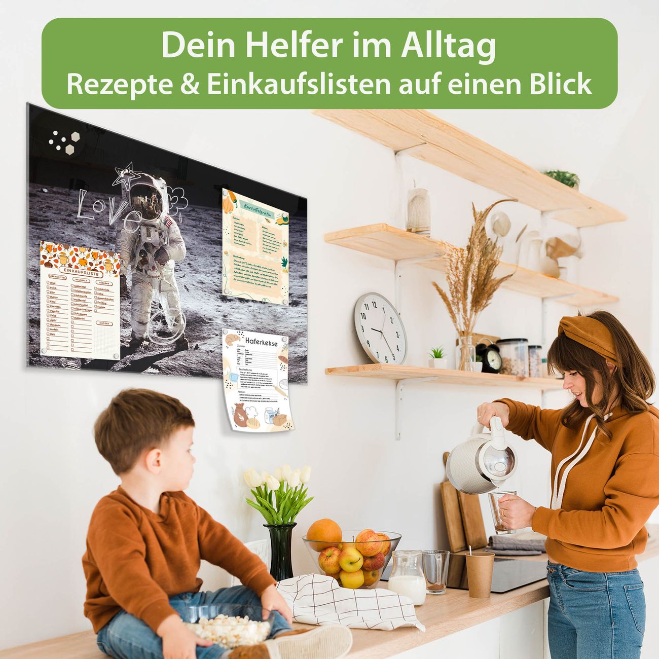 Ein Stück Design, das Ihren Alltag organisiert. Schreiben, heften, inspirieren - alles an einem Ort. Qualität, die man spürt. Montage leicht gemacht. Handwerk mit Herz - veredelt in Sachsen. Einzigartiges Design mit Motiv Motiv Astronaut Beschreibbare Glasoberfläche, leicht zu reinigen Starke Magnetkraft durch Stahlrückwand Inklusive 4 Neodym-Magneten Flexible Montageoptionen Handveredelt in Sachsen - Qualität, die bleibt
