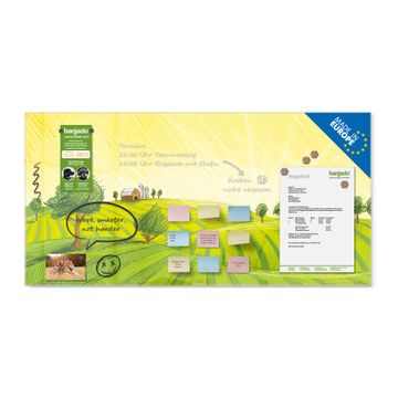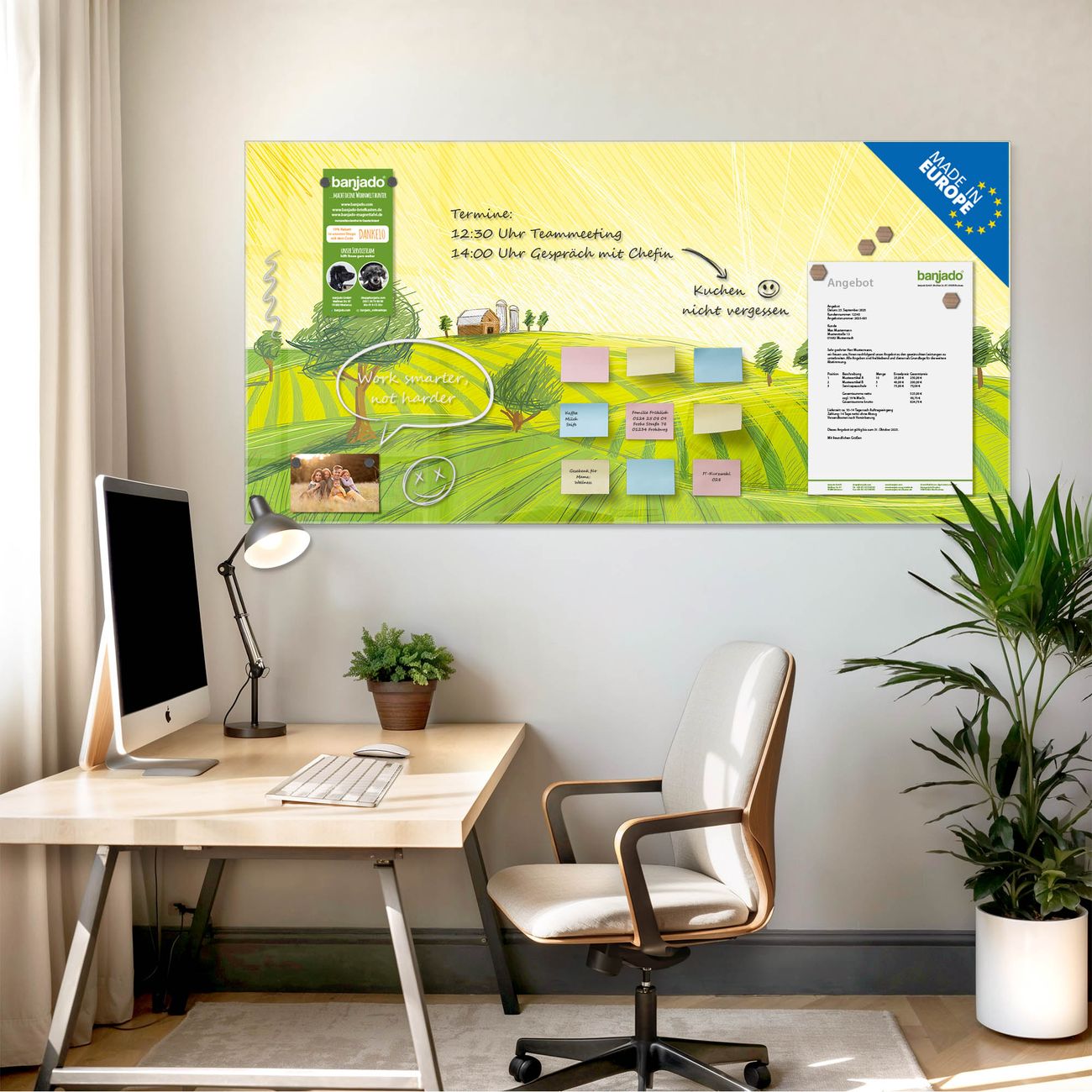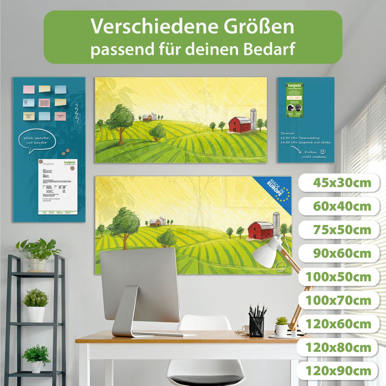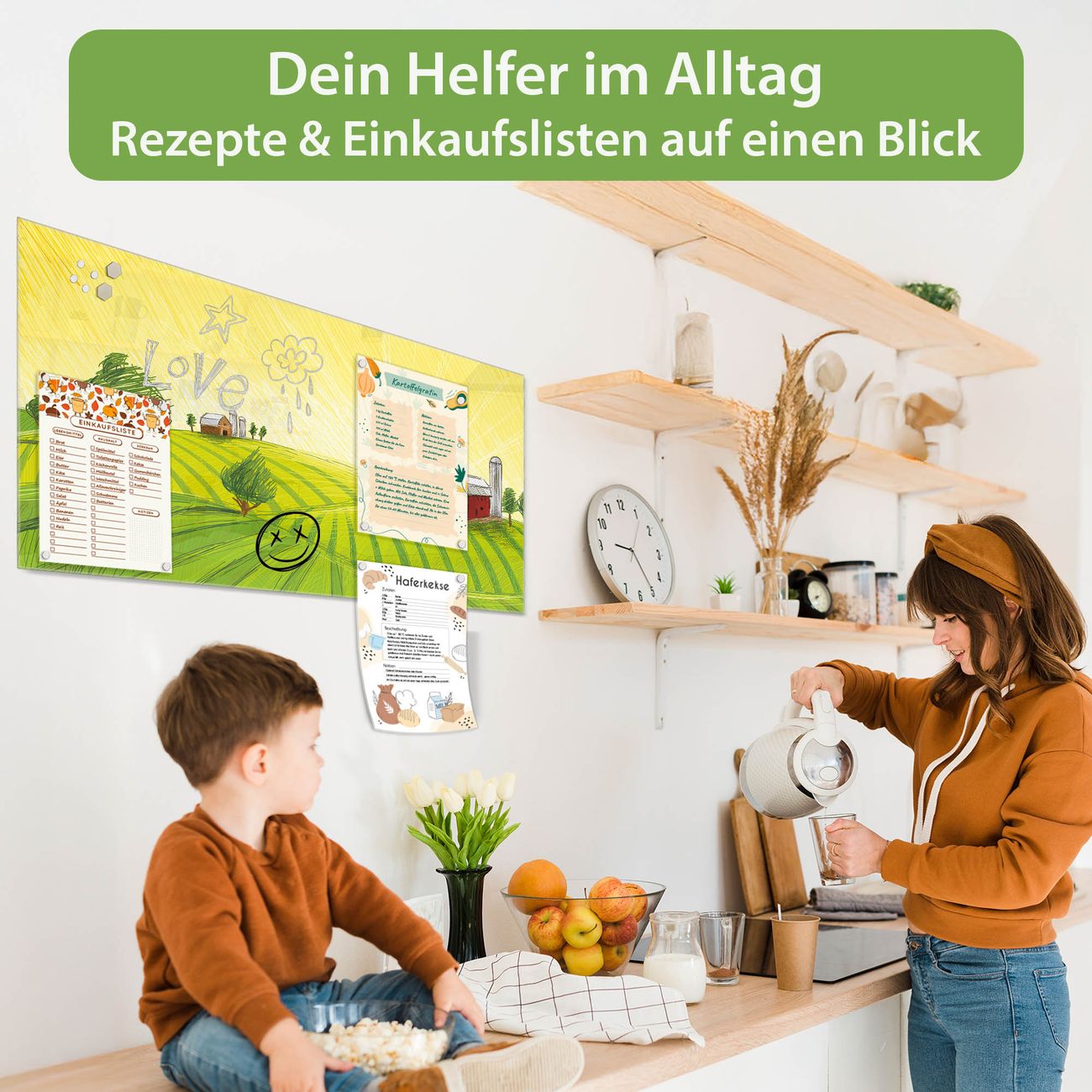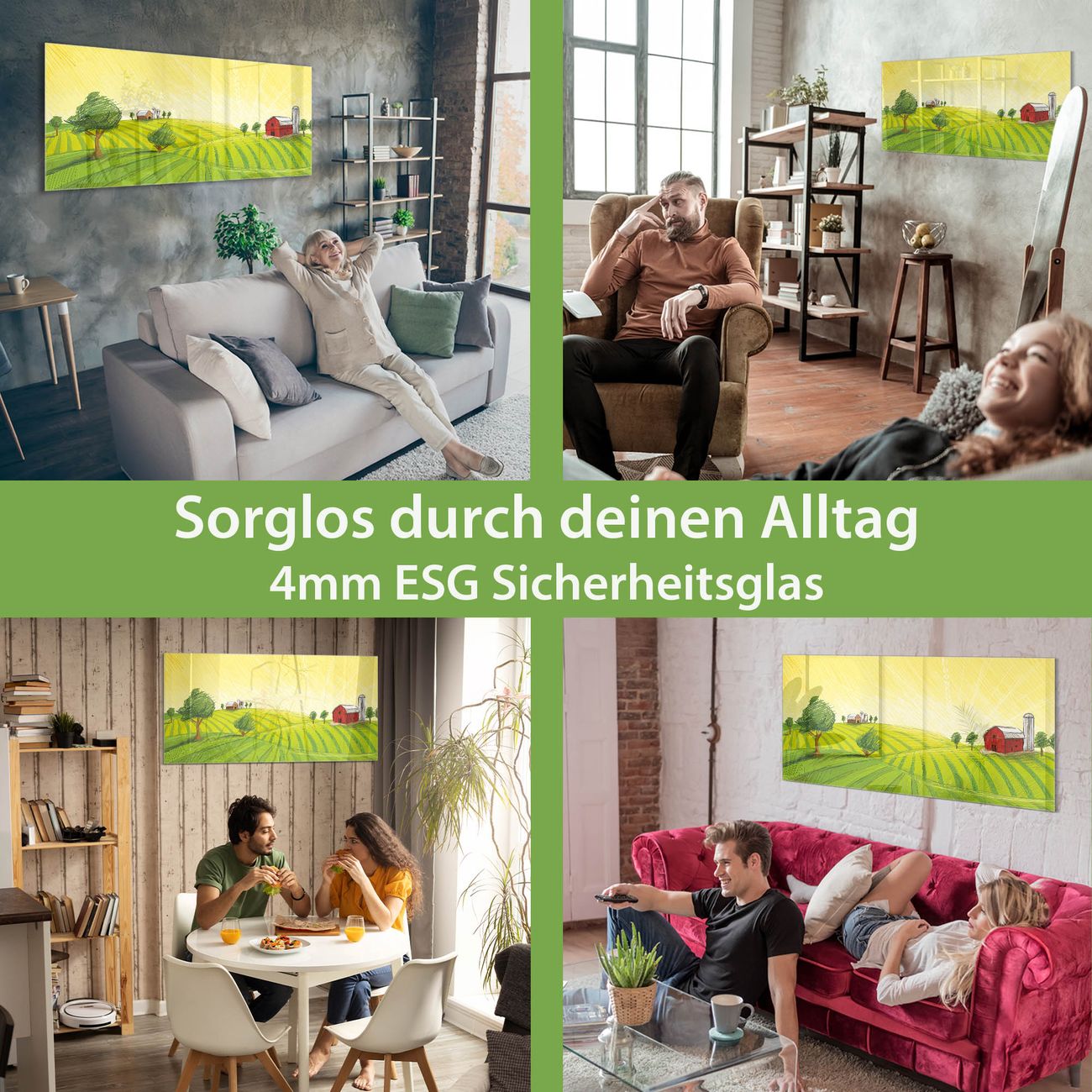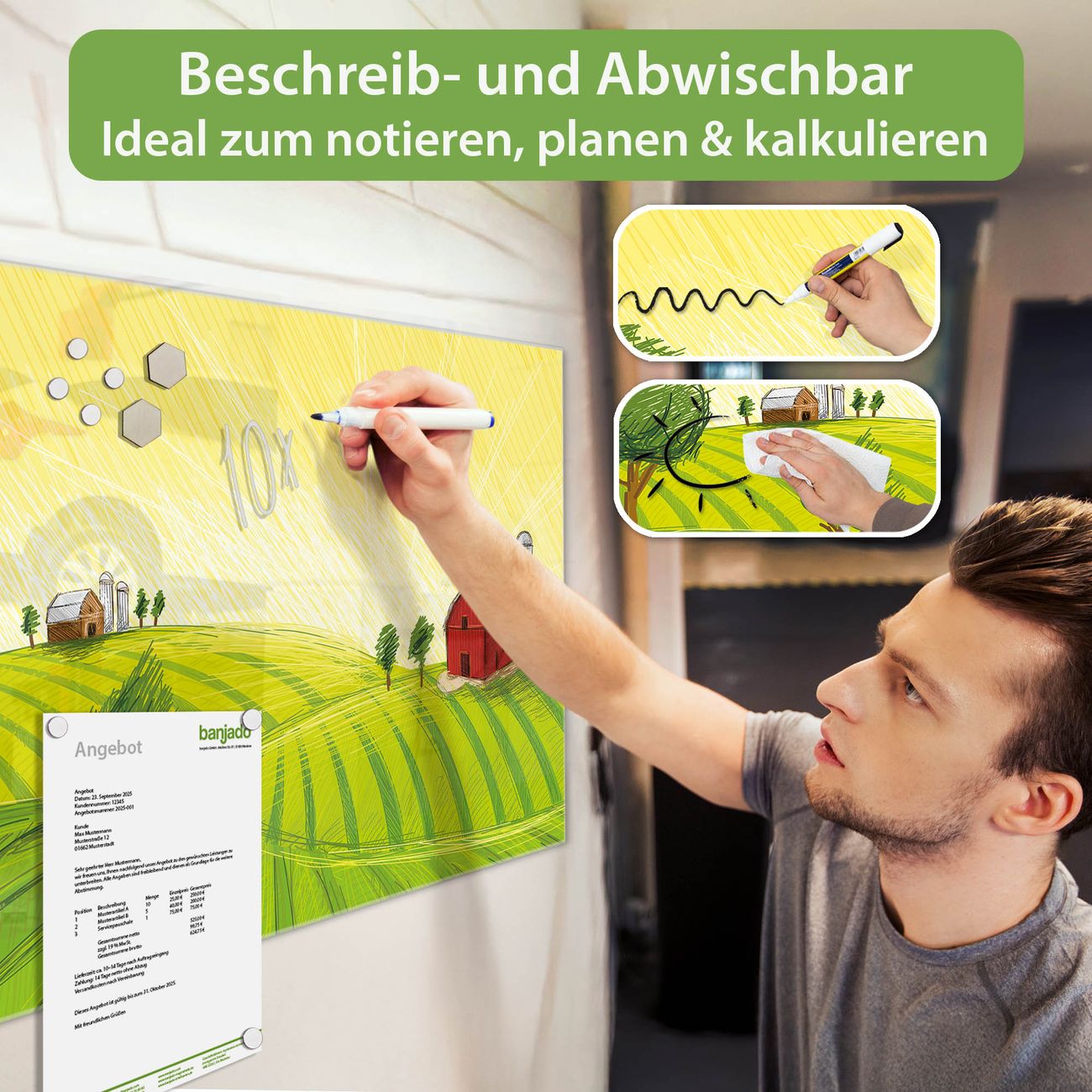 Material: 4mm Sicherheitsglas mit Metallrückwand Eigenschaften: beschreibbar, magnetisch, kratzfest Maße: 100x50x0,6cm, 7,50kg schwer Motiv Nummer 11155 Auf dem Land Zubehör: inklusive 4 Neodym-Magnete