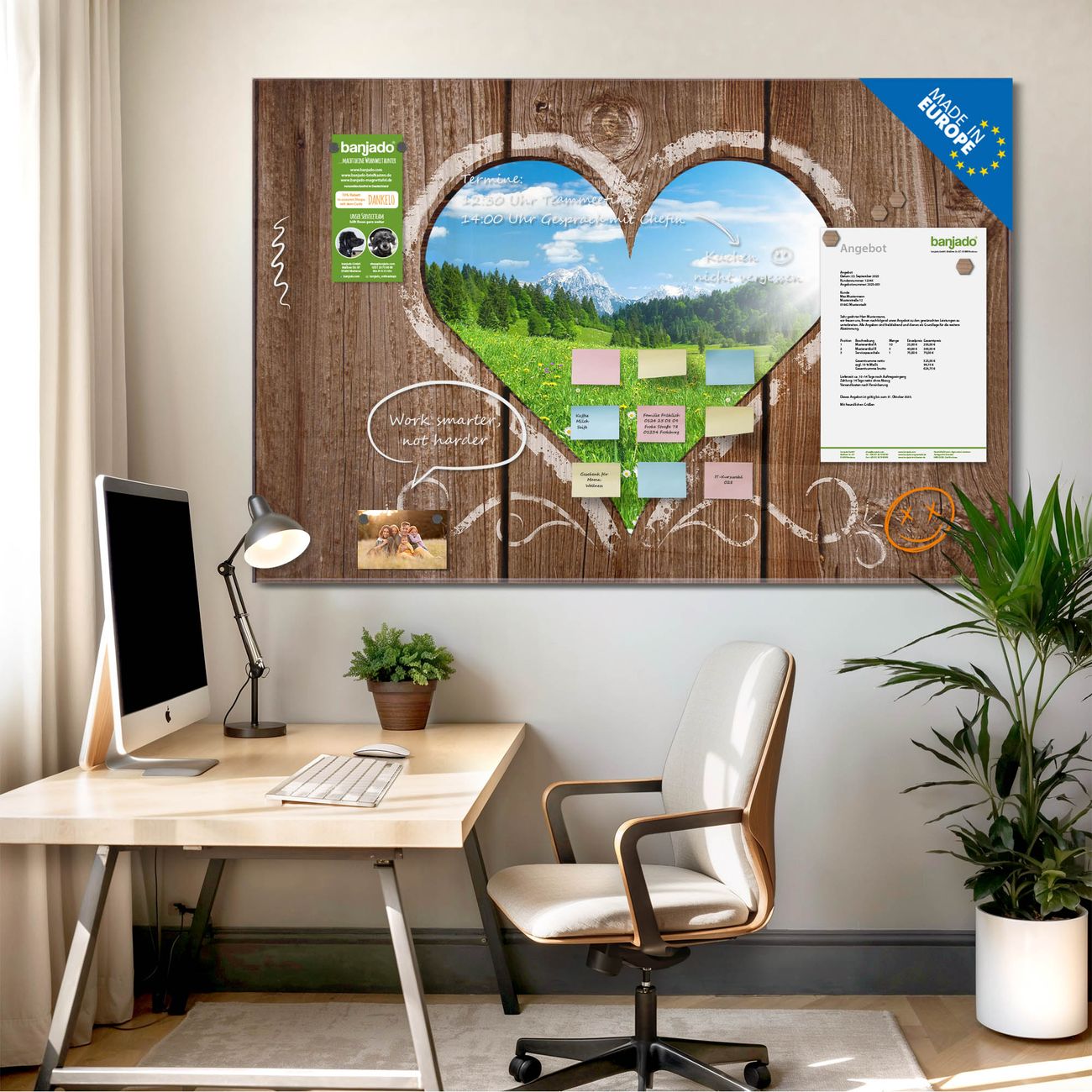 Die banjado Glas Magnettafel mit dem Motiv Motiv Ausblick mit Herz verbindet Funktionalität mit Stil. Sie ersetzt das Zettelchaos durch klare Strukturen und bringt dabei eine warme, natürliche Atmosphäre in Ihr Zuhause. Ob im Büro, in der Küche oder im Eingangsbereich - dieses Design-Board zieht Blicke an und sorgt für Ordnung mit Charakter.