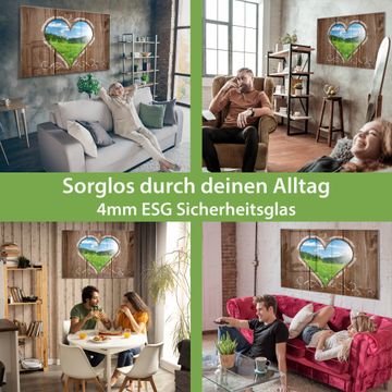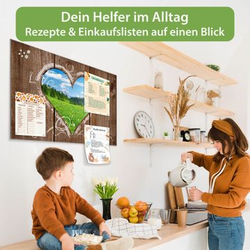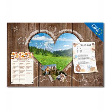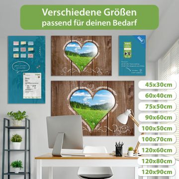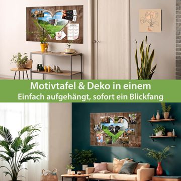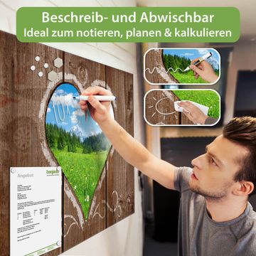 Material: 4mm Sicherheitsglas mit Metallrückwand Eigenschaften: beschreibbar, magnetisch, kratzfest Maße: 45x30x0,6cm, 2,03kg schwer Motiv Nummer 10113 Ausblick mit Herz Zubehör: inklusive 4 Neodym-Magnete